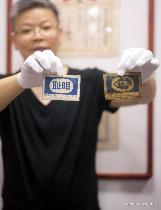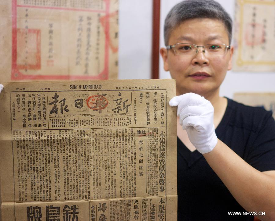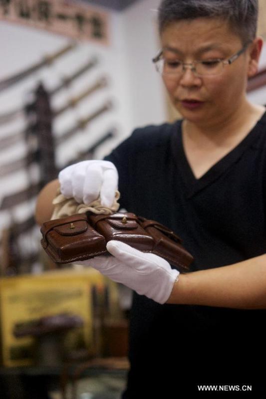 Hu Zhijie cleans badges of Chinese army at his museum in Nanchang, capital of east China's Jiangxi Province, July 7, 2015. The 44-year-old Hu Zhijie collected more than 10,000 historical objects of the anti-Japanese aggression war in Jiangxi Province, and founded his personal museum. (Photo: Xinhua/Hu Chenhuan)