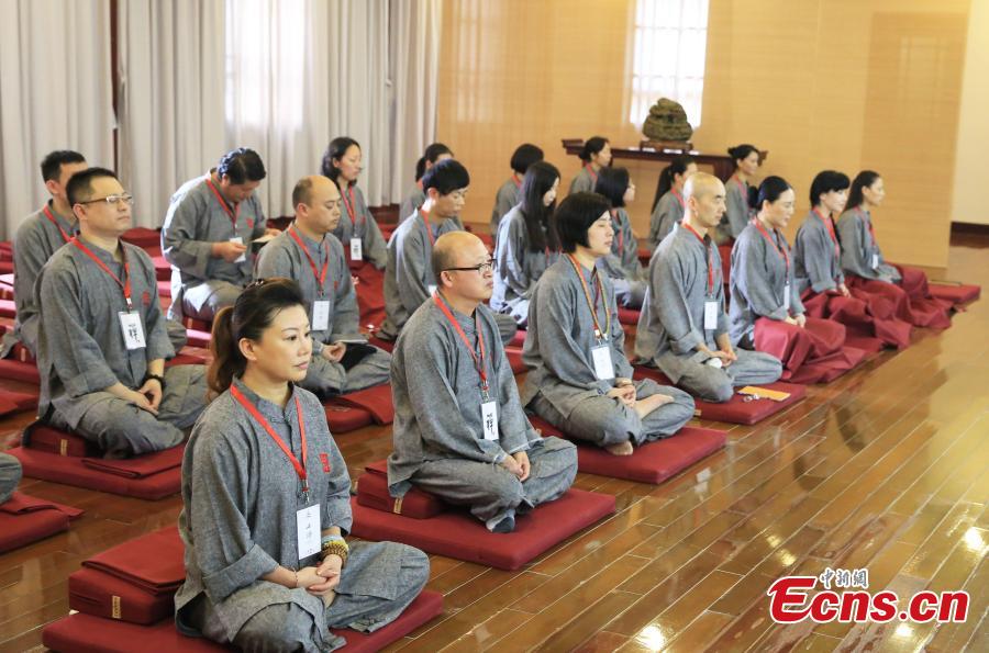 Citizens take part in a Zen class in the Yufo Temple, or Jade Buddha Temple, in Shanghai on July 8, 2015. Some 70 citizens went to the Yufo Temple on Wednesday afternoon to take part in a 2-day Zen class, where they wear the zen clothes and put away cellphones. (Photo: China News Service/Pan Suofei)