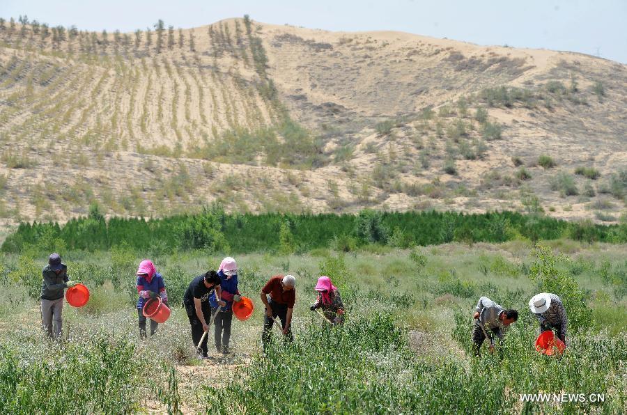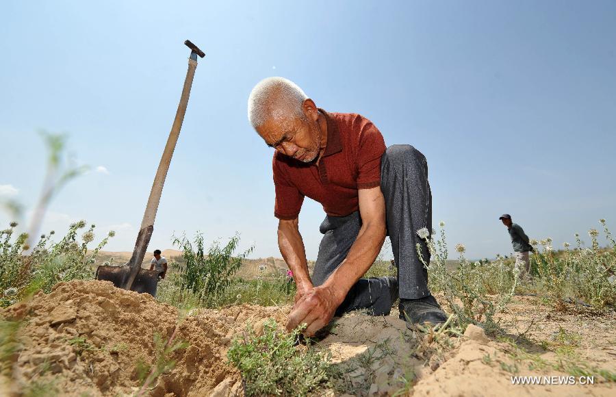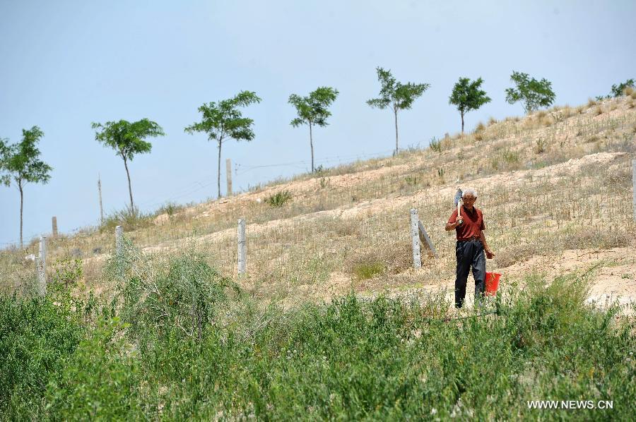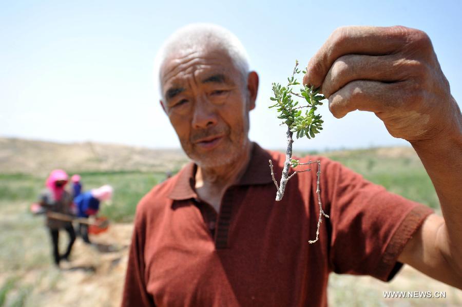 Qiu Jiancheng checks the growing status of tetraena mongolica in Mahuanggou area in Shizuishan City, northwest China's Ningxia Hui Autonomous Region, July 8, 2015. Tetraena mongolica is a narrowly monotypic genus of Zygophyllaceae found in a very limited area in border areas of Ningxia and Inner Mongolia. To protect this rare plant species, Qiu and technicians of Beishawo forest farm have searched for better transplant areas since May and made a breakthrough. (Photo: Xinhua/Peng Zhaozhi)