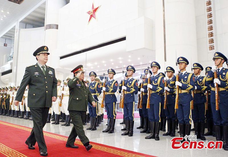 Chinese Defense Minister Chang Wanquan (L) and visiting Lao Defense Minister Sengnuan Saiyalath inspect the guards of honor before their talks in Beijing, capital of China, July 8, 2015. (CNS photo/Song Jihe)