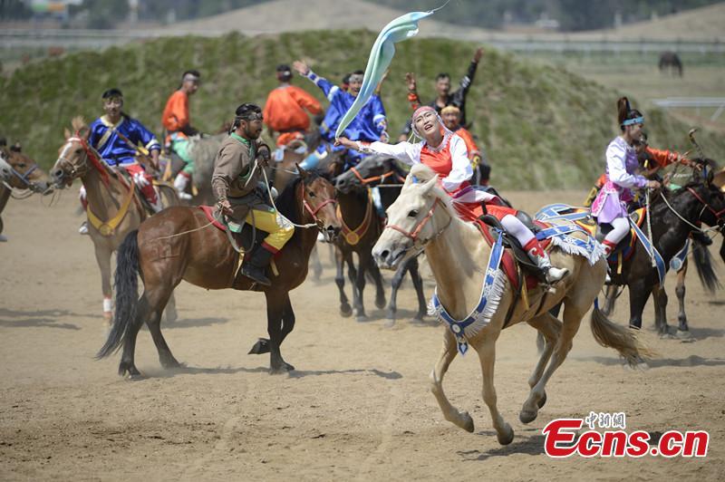 Actors of the Mongolian team perform the live drama "Forever Genghis Khan" in Inner Mongolia which is about 50 minutes in Hohhot, capital of Inner Mongolia, July 8, 2015. (CNS photo/Liu Wenhua)