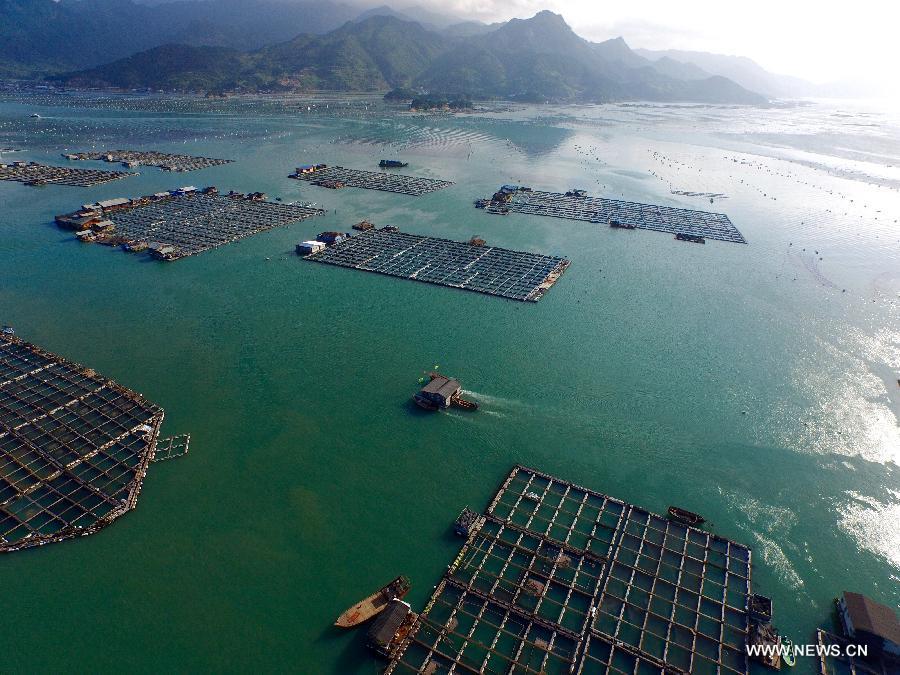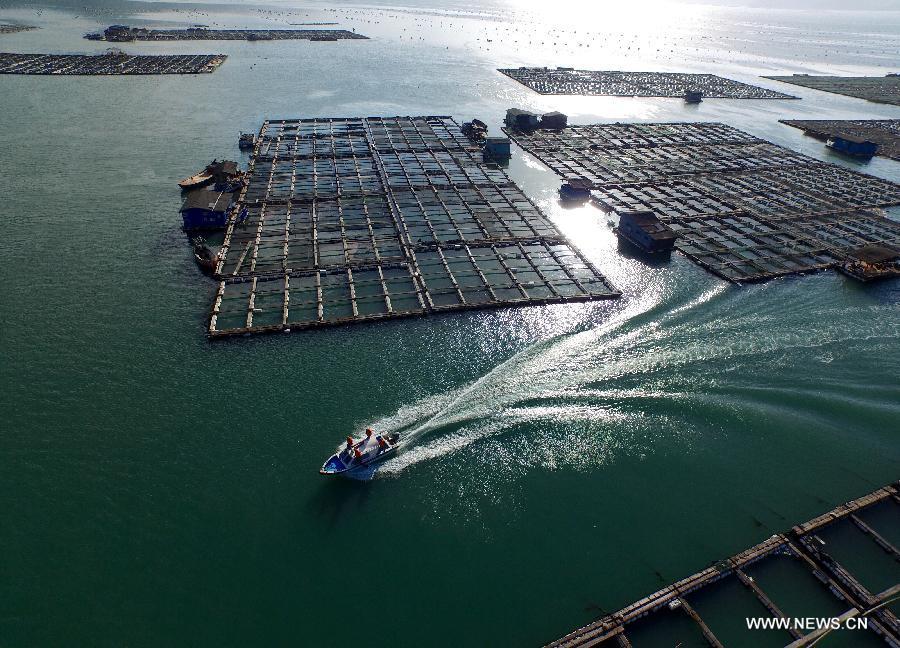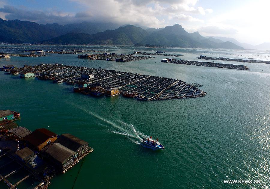 A boat sails at aquaculture area in Ningde, southeast China's Fujian Province, July 9, 2015. Typhoon Chan-Hom is approaching east China fast and it is expected to land in Zhejiang on late Friday night or Saturday morning as a super typhoon. (Photo: Xinhua/Jiang Kehong)