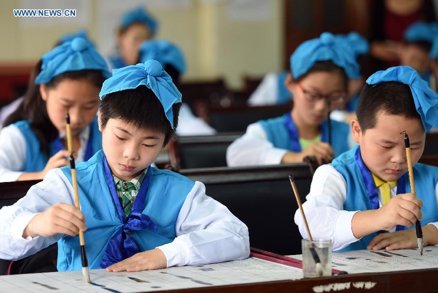 Children study calligraphy in a summer class provided free of charge by a community in Hefei, capital of east China's Anhui Province, July 9, 2015. (Photo: Xinhua/Liu Junxi)