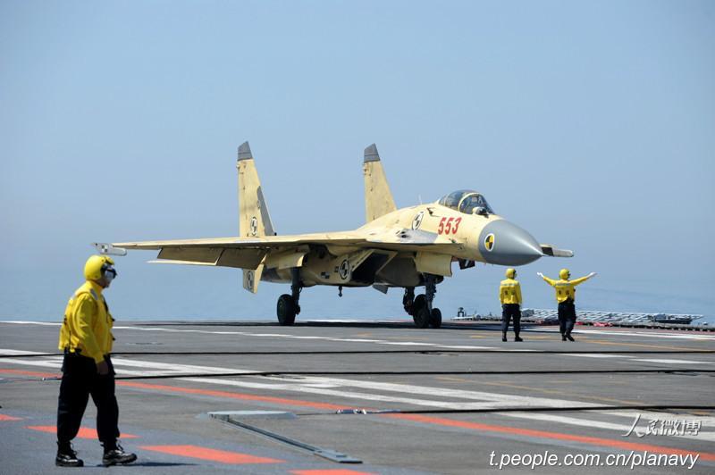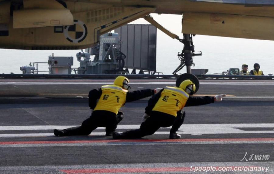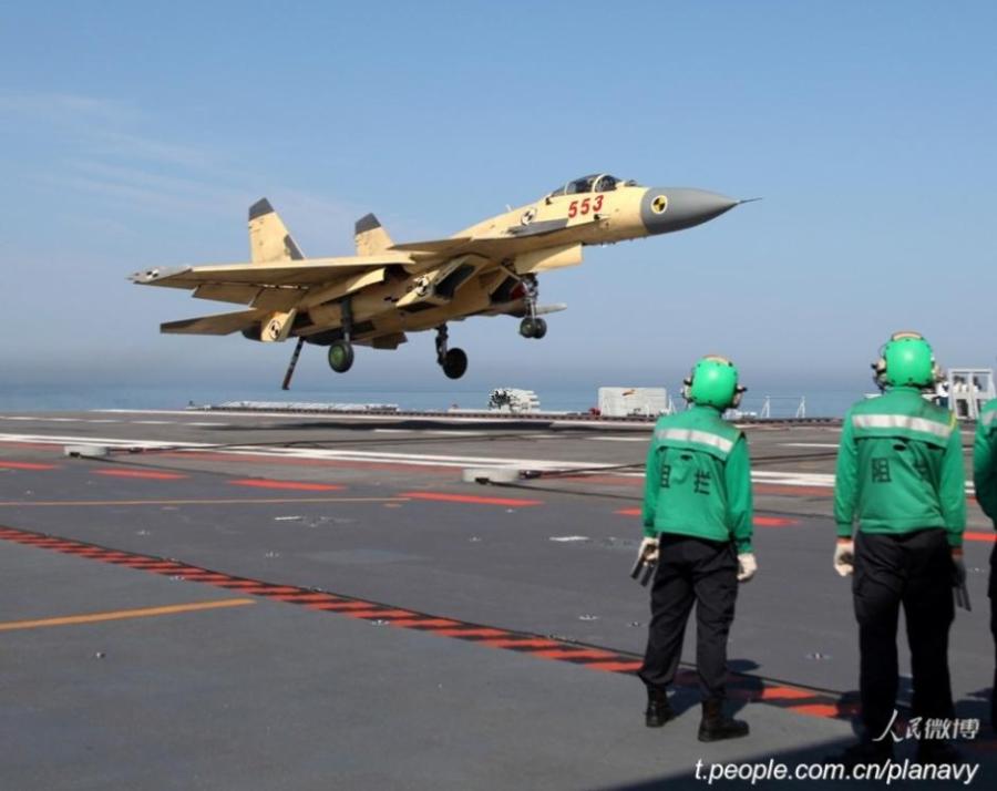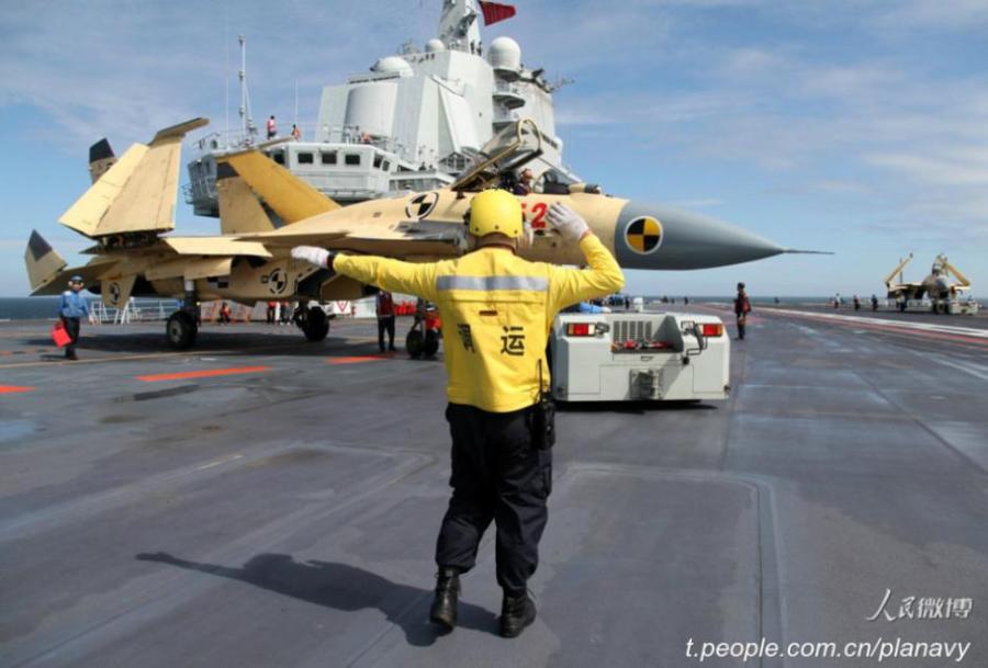 The official micro blog of Chinese PLA navy releases a group of photos showing China's aircraft carrier Liaoning in training, July 8, 2015. The ship-borne J-15 fighters conducted take-off and landing training on the ship. (Photo/t.people.com.cn/planavy)