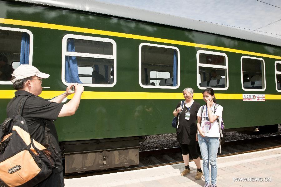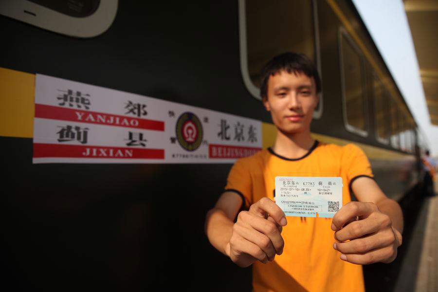 A passenger poses for photo beside a train of the newly-opened intercity rail line linking Beijing and Jixian county of Tianjin, at Beijing East Railway Station in Beijing, capital of China, July 10, 2015. Two trains in each direction ran on the intercity rail line that opened on Friday.(Photo/Xinhua)