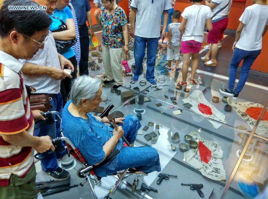 People visit the "Great Victory, Historic Contribution" exhibition in Beijing, capital of China, July 11, 2015. A total of 1,170 pictures and 2,834 artifacts are on display at the Museum of the War of Chinese People's Resistance against Japanese Aggression near Lugou Bridge, also known as Marco Polo Bridge, where Japan's full-scale invasion of China began 78 years ago. (Photo: Xinhua/Cheng Tingting)