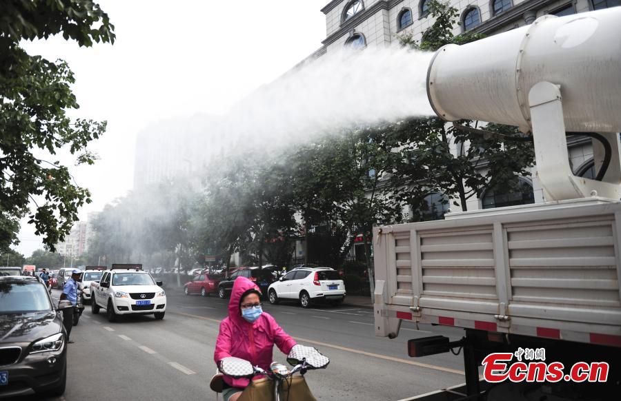 A vehicle sprays water as sanitation workers clean a street on a hot day in Ji’nan city, capital of East China’s Shandong province, July 13, 2015. The vehicle was used to help cool people off as temperatures rose to nearly 40 degrees Celsius in the city on Monday. (Photo: China News Service/Zhang Yong)