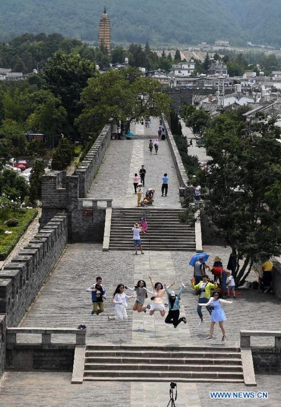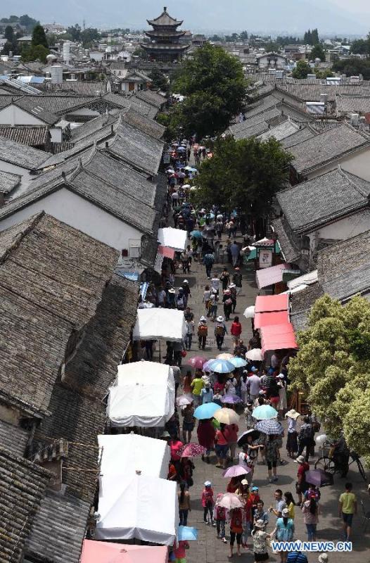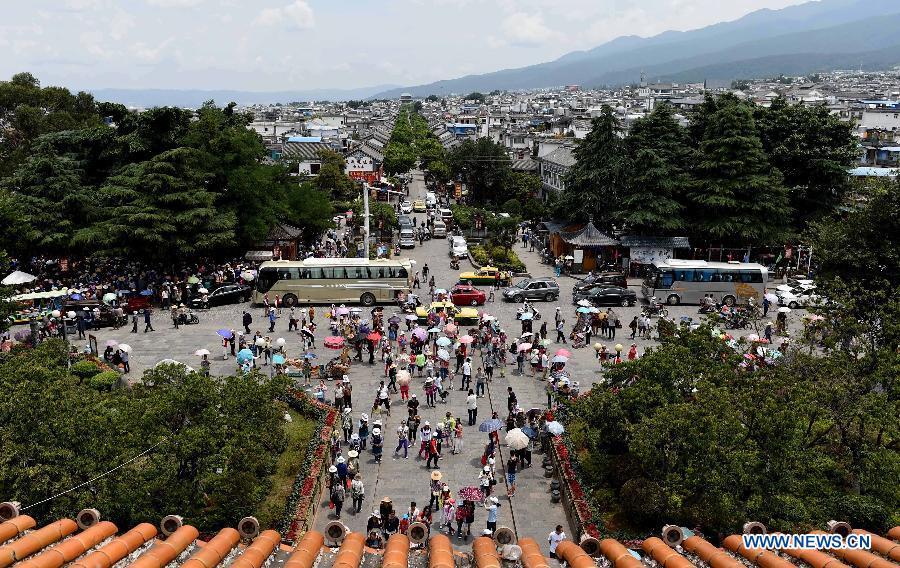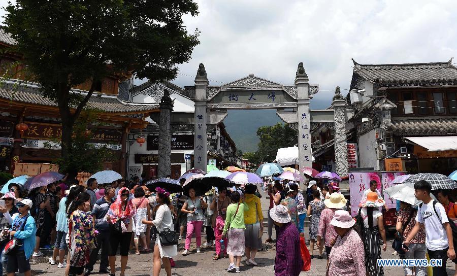 Tourists visit the ancient town of Dali in southwest China's Yunnan Province, July 13, 2015. With its beautiful scenery, rich cultural heritages and hospitable weather, Dali enters its peak tourism season every summer. (Photo: Xinhua/Lin Yiguang)