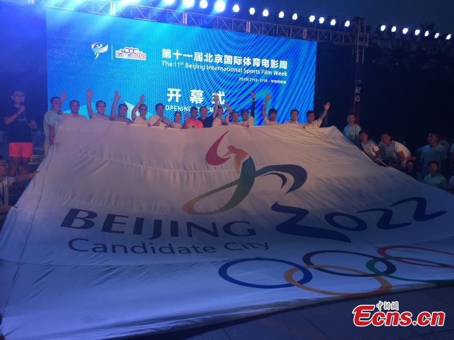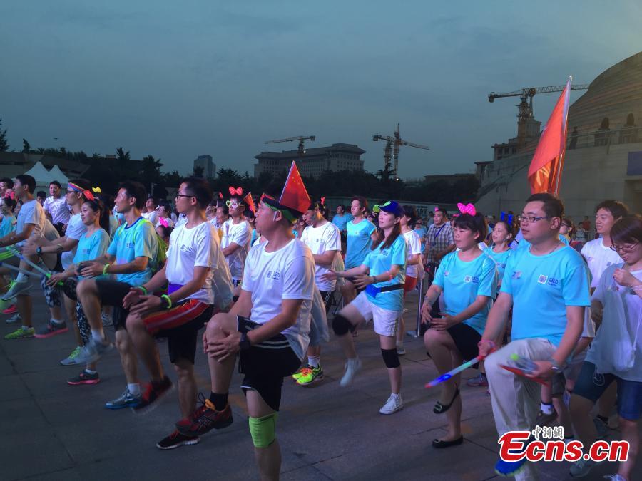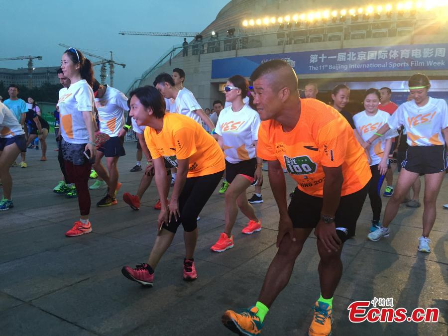 China's ultra-marathon runner Chen Penbin (R) warms up for a nighttime running event during the opening ceremony of the Beijing International Sports Film Week in Beijing, July 13, 2015. China's ultra-marathon runner Chen Penbin, who has completed 100 marathons in 100 consecutive days, joined 300 participants in the event to support Beijing’s bid to host the 2022 Winter Olympics. (Photo: China News Service/Zeng Ding)