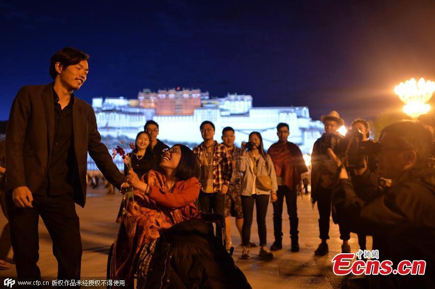 Ding Yizhou proposes to his girlfriend Lai Min in front of the Potala Palace in Lhasa, Tibet autonomous region, July 5, 2015. The pair started their trip on January 1 with a plan to follow a heart-shaped route from Liuzhou, Guangxi Zhuang autonomous region, to their destination. Lai suffers from a serious illness that leaves her unable to walk or swallow. For much of the journey, Ding pushed his partner in her wheelchair and they also used an electric vehicle. After a six-month journey of more than 4,000 kilometers, the couple arrived in Lhasa on July 1. (Photo/CFP)