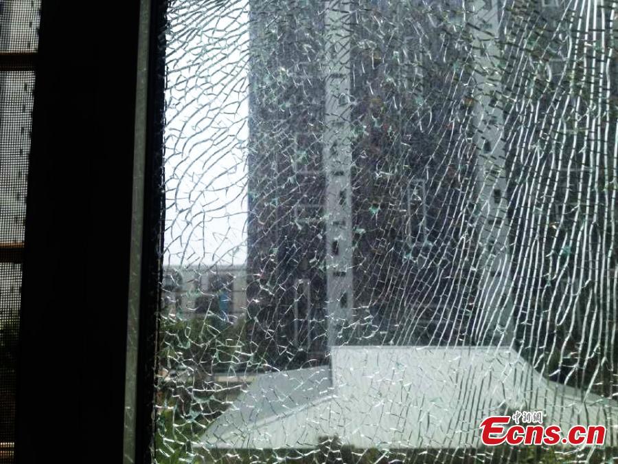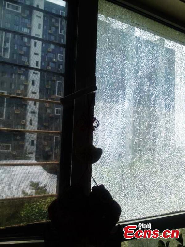 A woman points to cracks in a glass window in Qinhuangdao city, North China’s Hebei province, July 13, 2015. The damage is thought to be related to high temperatures of approximately 36 degrees Celsius in the city. (Photo: China News Service/Wang Haibin)