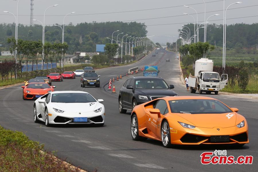 A fleet of Lamborghini sports cars drives on a road in the ancient town of Huizhou in Huangshan city, East China’s Anhui province, July 14, 2015. Lamborghini China is commemorating its 10-year anniversary of entering the Chinese market with a tour – The China Giro. More than 20 high-end Lamborghini sports cars visited Huizhou, which is one of the best preserved ancient towns in China. (Photo: China News Service/Fangye Yalei)