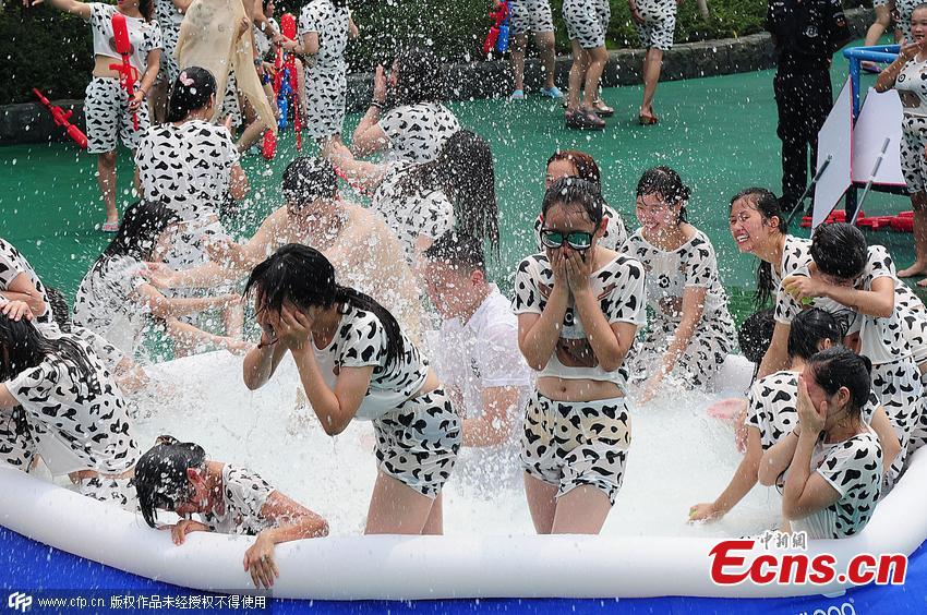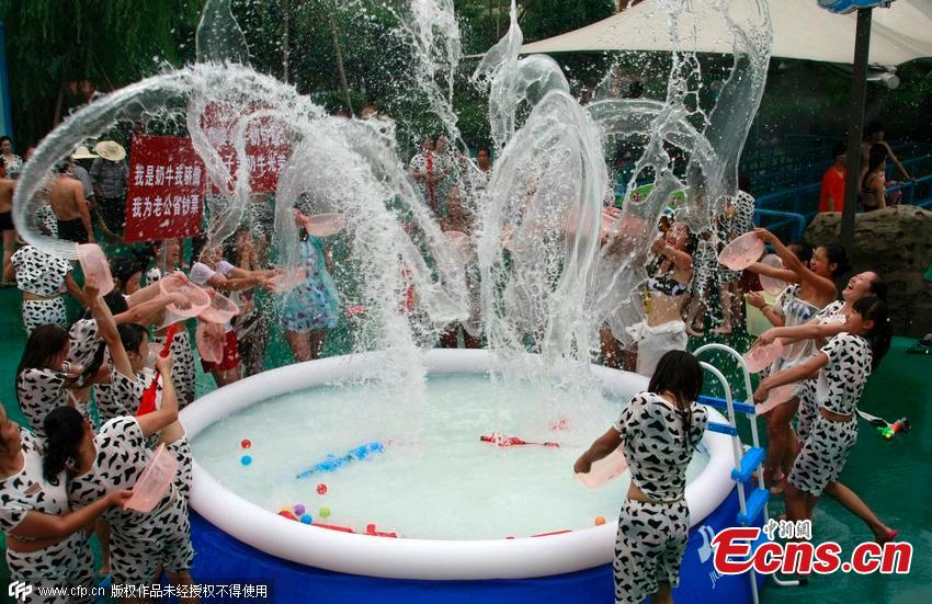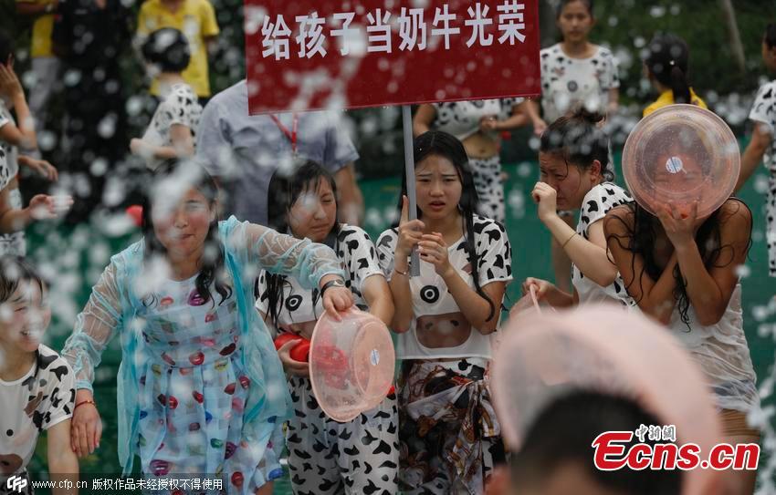 Participants play with milk-like water during an event at a water park in Hangzhou city, capital of East China’s Zhejiang province, July 15, 2015. About 100 new mothers attended the activity to raise public awareness of and support for breastfeeding. (Photo/CFP)