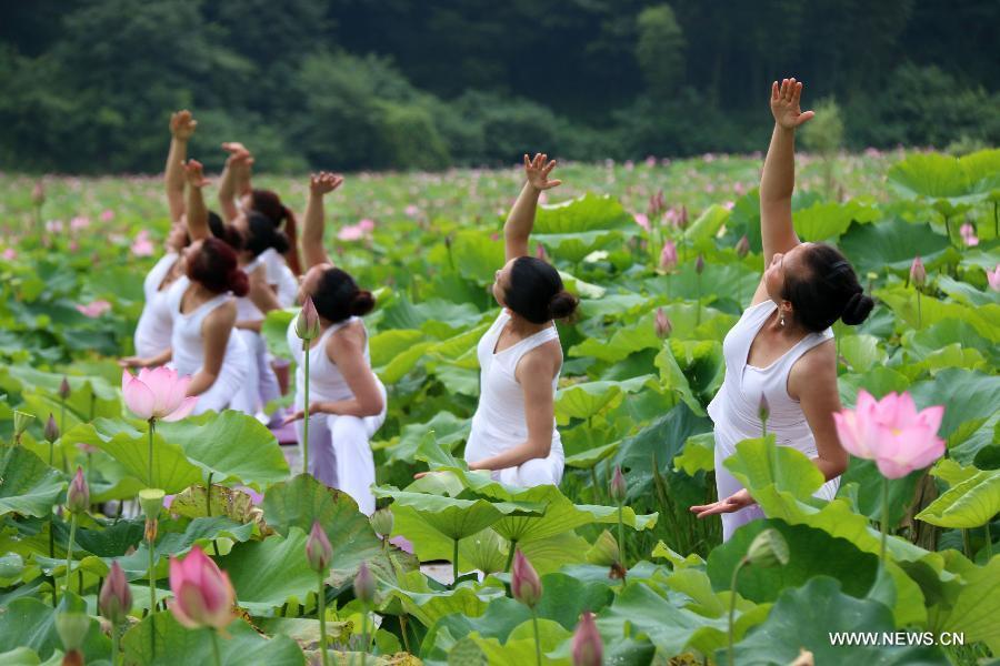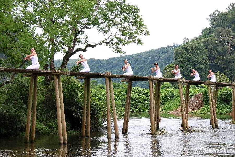 Yoga lovers practice in Bazhouhe National Wetland Park in Liping, southwest of China's Guizhou Province, July 16, 2015. (Photo: Xinhua/Yang Daofi)