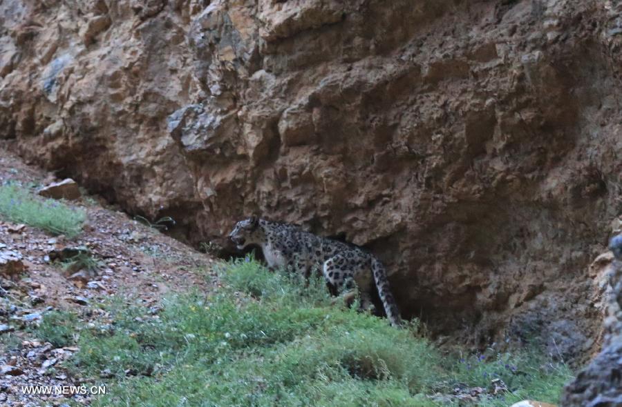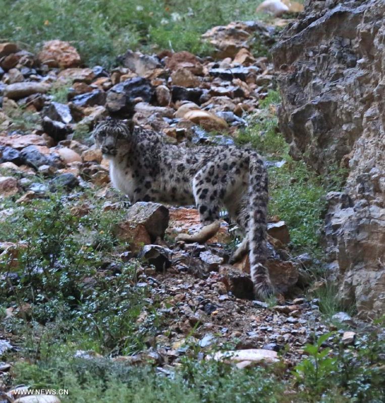 Photo taken on July 14, 2015 shows a snow leopard appearing in the Himalayas at an altitude of about 3900m in Woma Village, five km from Jilong Town of Shigatse City, southwest China's Tibet Autonomous Region. Snow leopard is an endangered species whose global population is estimated less than ten thousand. (Xinhua/Dong Jialin)