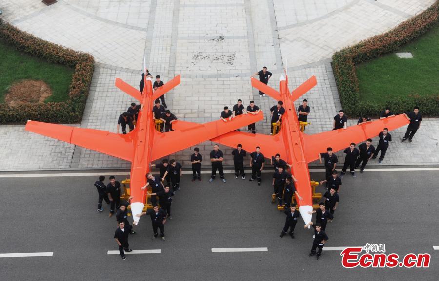 July 18th, Changsha, teachers and students of Changsha Aeronautical Vocational and Technical College are carrying two drones, which are provided by a Chinese air force factory. (CNS photo/Yang Huafeng)