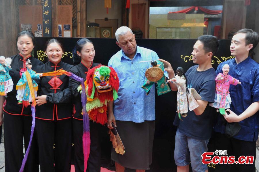 July 17th, Fuzhou, Josaia Voreqe Bainimarama(center), prime minister of Fiji, is interested in traditional hand puppet. He started his visiting to Fujian province from this day. (CNS photo/ Wang Dongming)