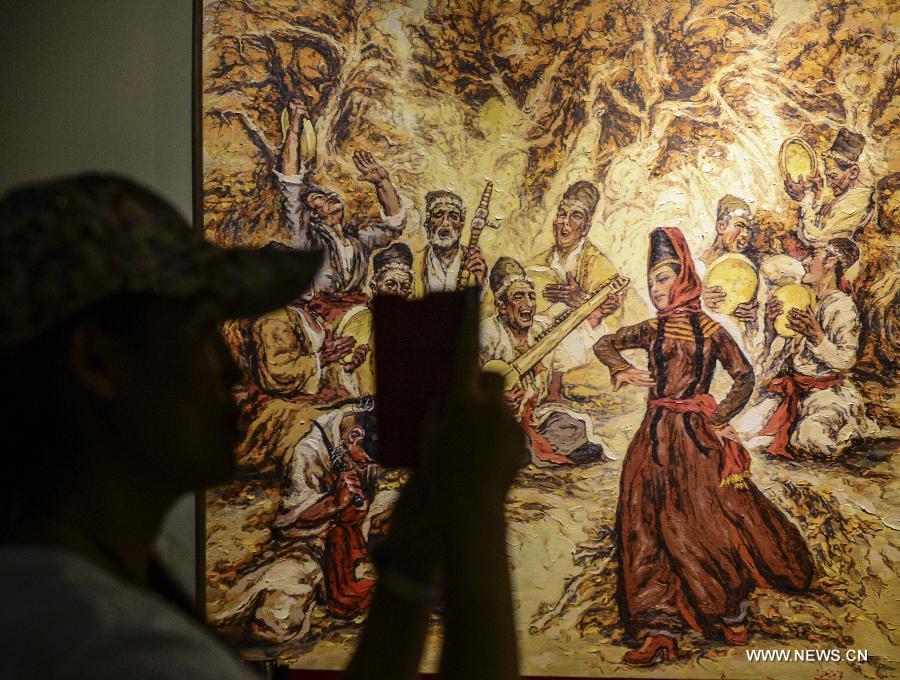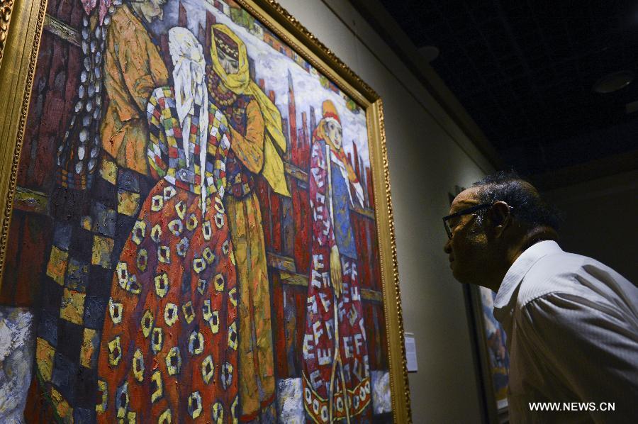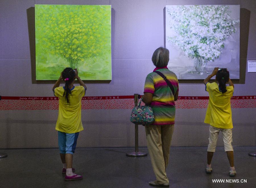 Visitors look at paintings in Xinjiang Museum in Urumqi, capital of northwest China's Xinjiang Uygur Autonomous Region, July 19, 2015. A total of 54 paintings created by 51 artists from Xinjiang was displayed at a exhibition showcasing the 10 years development of Xinjiang painting. (Photo: Xinhua/Wang Fei)
