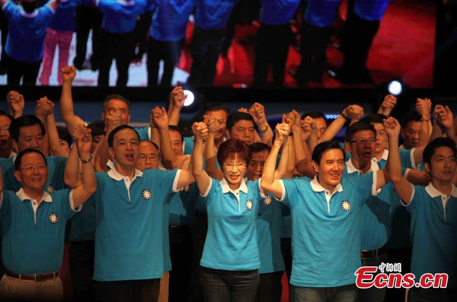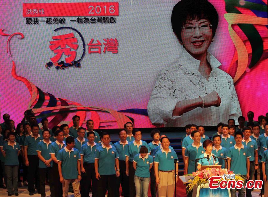 Hung Hsiu-chu (center) delivers a speech after she is nominated as Kuomintang party’s candidate in the Taiwan leadership election next January in Taipei, Taiwan, July 19, 2015. Hung, 67, is set to face Tsai Ing-wen, 58, chairwoman of the opposition Democratic Progressive Party, who was nominated in April for the 2016 election. Hung, deputy head of the island's legislature and the only contender in the party primary, secured the party's 30 percent support threshold in public polls in June with an average rating of 46.2 percent. (Photo: China News Service/Xing Liyu)