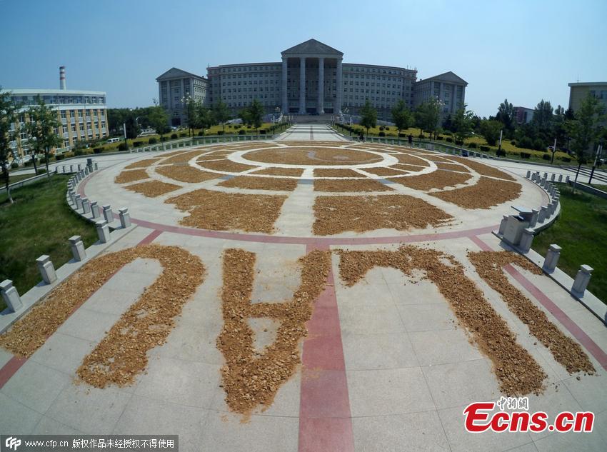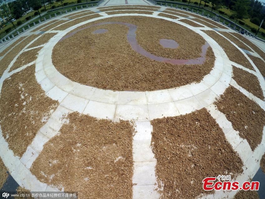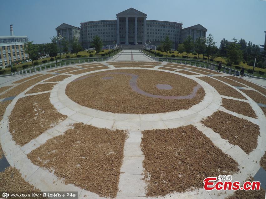Enokitake mushrooms, which are known as golden needle mushrooms, are air dried at a square on the campus of Jilin Agricultural University in Changchun city, Northeast China’s Jilin province, July 19, 2015. The mushrooms have been placed on red bricks, and they form the shape of the eight trigrams or Bagua, a group of symbols that hold deep meaning in Chinese philosophy. (Photo/CFP)