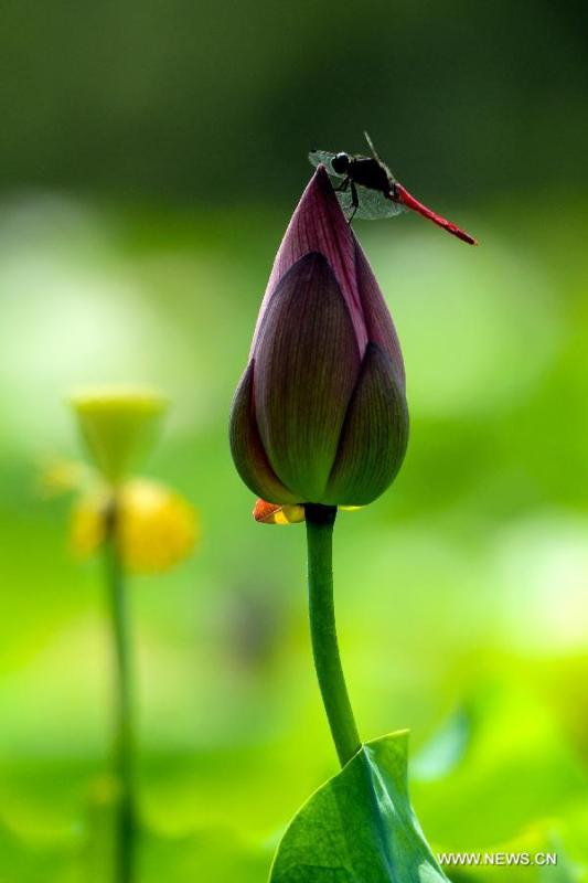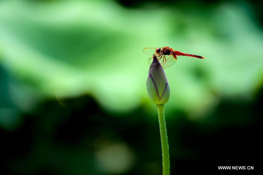 A dragonfly stays on a lotus bud at a lotus base of Pingguo County in Baise, southwest China's Guangxi Zhuang Autonomous Region, July 19, 2015. The lotus base is more than 260 hectares with nearly 400 varieties of lotus blooming in summer. (Photo: Xinhua/Wei Wanzhong)