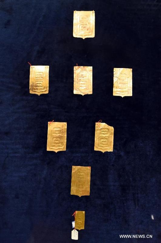 People visit a public exhibition of Chinese cultural relics returned by French private collectors, at Gansu Provincial Museum in Lanzhou, capital of northwest China's Gansu Province, July 20, 2015. Thirty-two gold ornaments stolen from ancient Chinese tombs and held by French private collectors Francois Pinault and Christian Deydier were formally handed over to Gansu Provincial Museum on Monday. The 32 gold items came from tombs in Dabuzishan in Lixian County, Gansu Province dating back to the Spring and Autumn period (770 BC-476 BC). The tombs were badly looted during the 1990s and a large number of relics, including the gold ornaments, were smuggled abroad. (Photo: Xinhua/Fan Peishen)