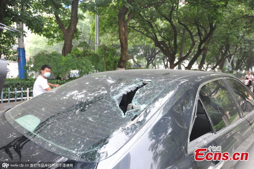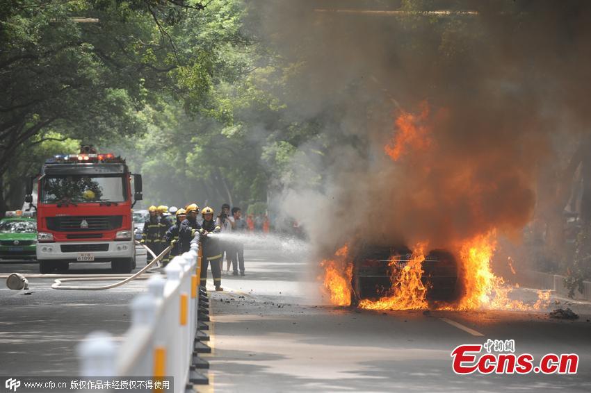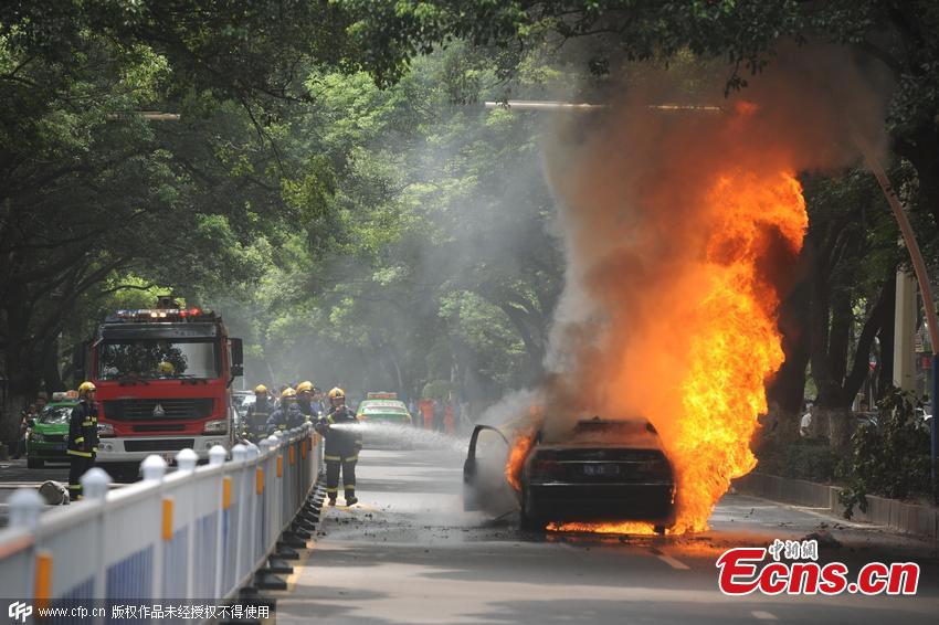 Firefighters try to put out a car fire in Nanchang, East China’s Jiangxi province, July 20, 2015. The driver of a BMW set fire to his own car after thinking he was being followed. He then attacked the driver of a Toyota car with an ax, causing damage to the car and leaving the driver unhurt. (Photo/CFP)