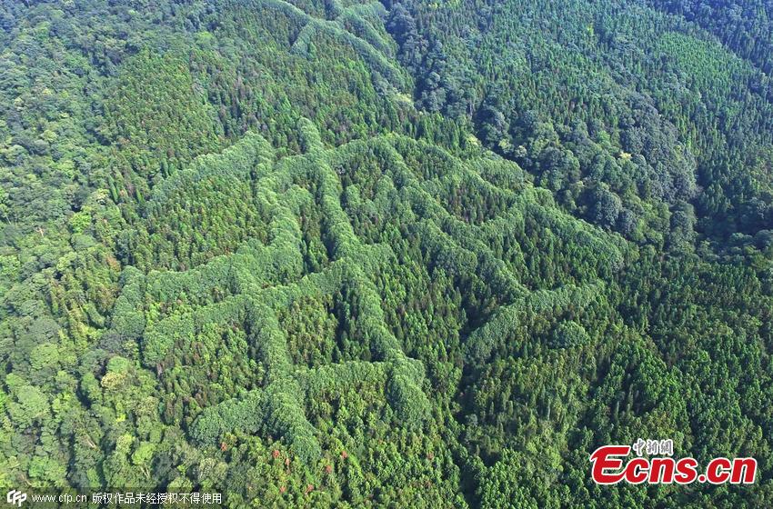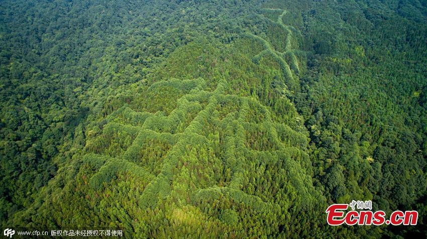 Plants form the shape of the giant Chinese character Ben (meaning run quickly) on a tree-covered mountain ridge in Qionglai city, Southwest China’s Sichuan province, July 20, 2015. The shape also resembles people holding hands. It’s unknown if the shape is manmade or naturally occurring. (Photo/CFP)
