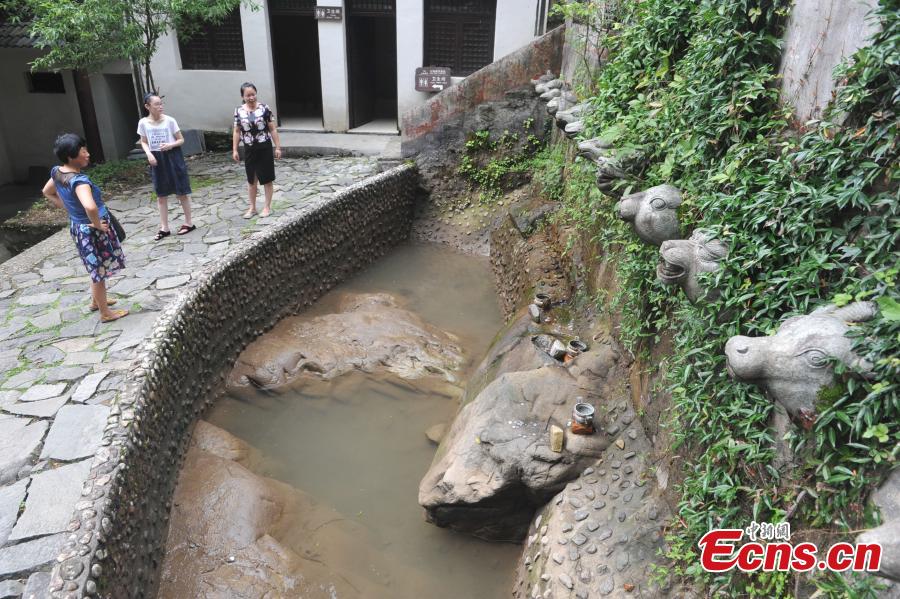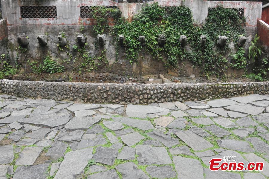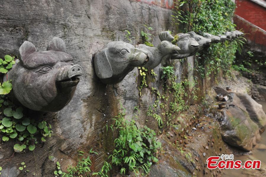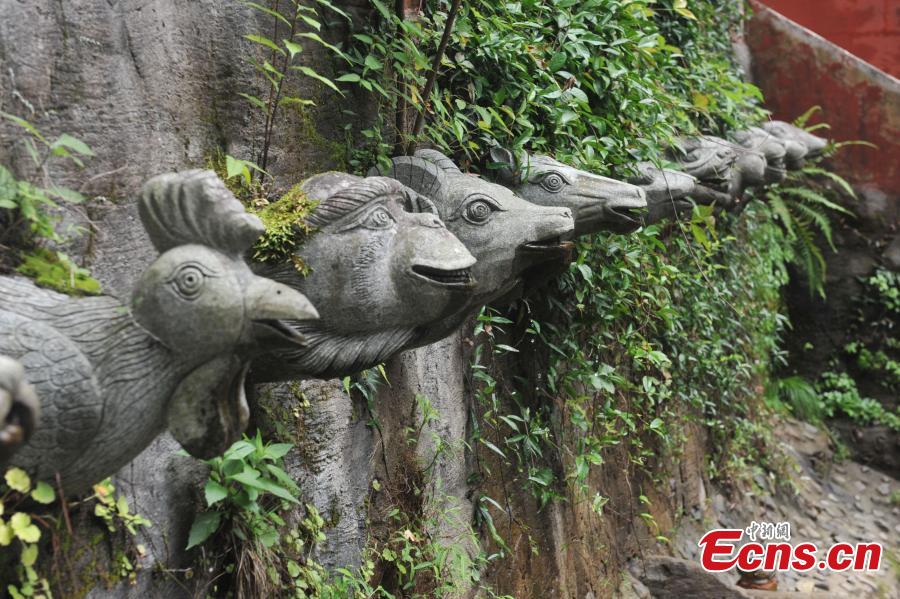 Replicas of zodiac animal sculptures from Yuan Ming Yuan (also called the Old Summer Palace) are displayed at a scenic spot in Lin’an city, East China’s Zhejiang province, July 20, 2015. In the past, the bronze sculptures of the 12 Chinese zodiac animals in the Old Summer Palace had water pipes protruding from their mouths that projected water. (Photo: China News Service/Hu Jianhuan)