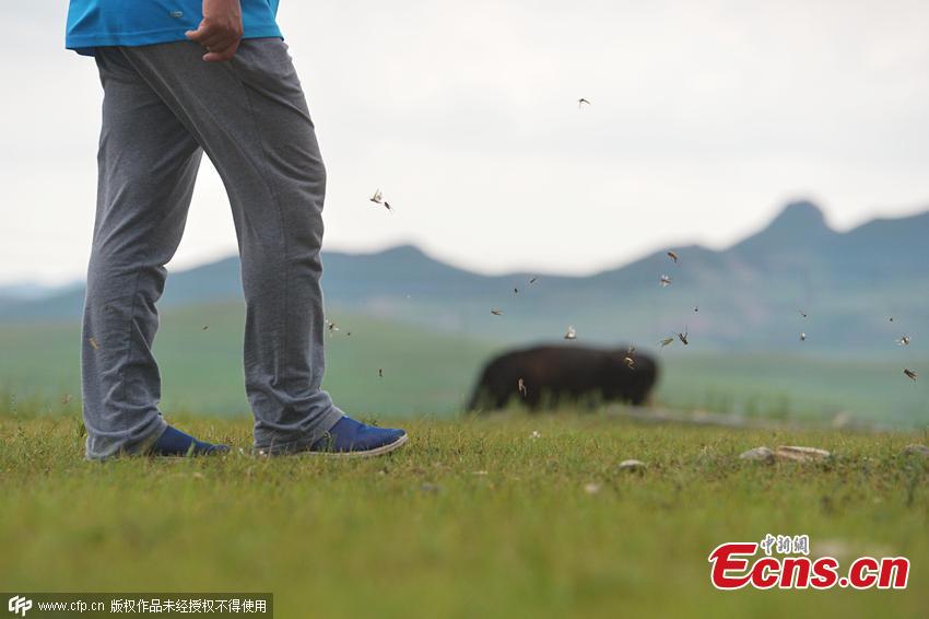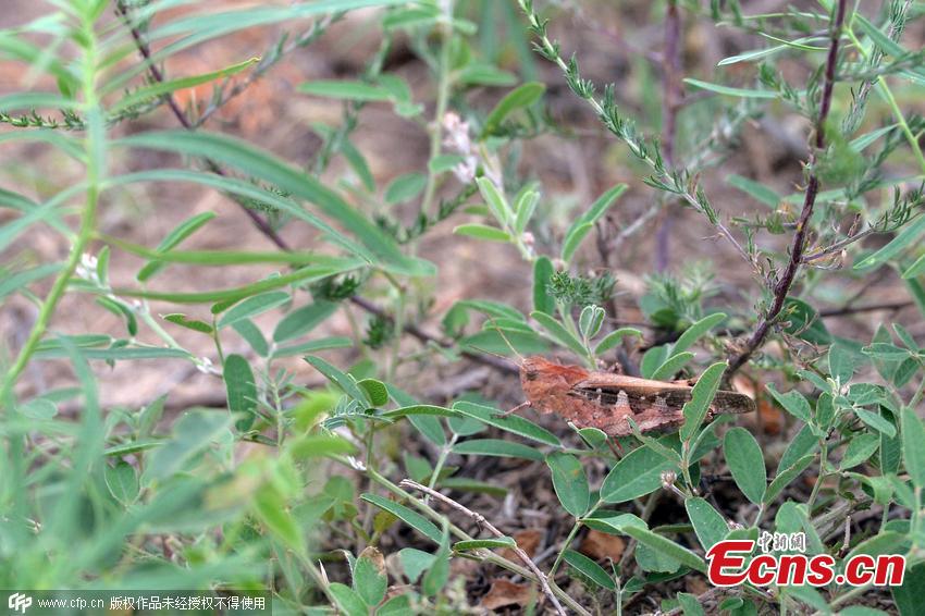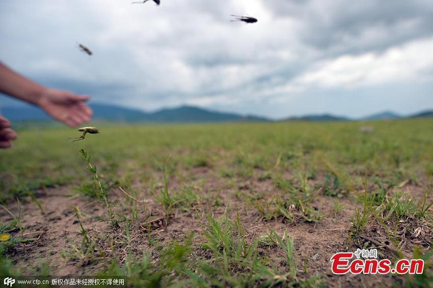 Locusts are seen on grassland in Chifeng, North China’s Inner Mongolia autonomous region, July 22, 2015. An area of approximately 27,200 hectares in Chifeng’s Baarin Left Banner is under attack, with an average concentration of 42 locusts per square meter. In some areas, the density rises to 123. Both chemical and biological means are being used to fight the locusts. (Photo/CFP)