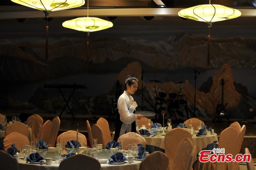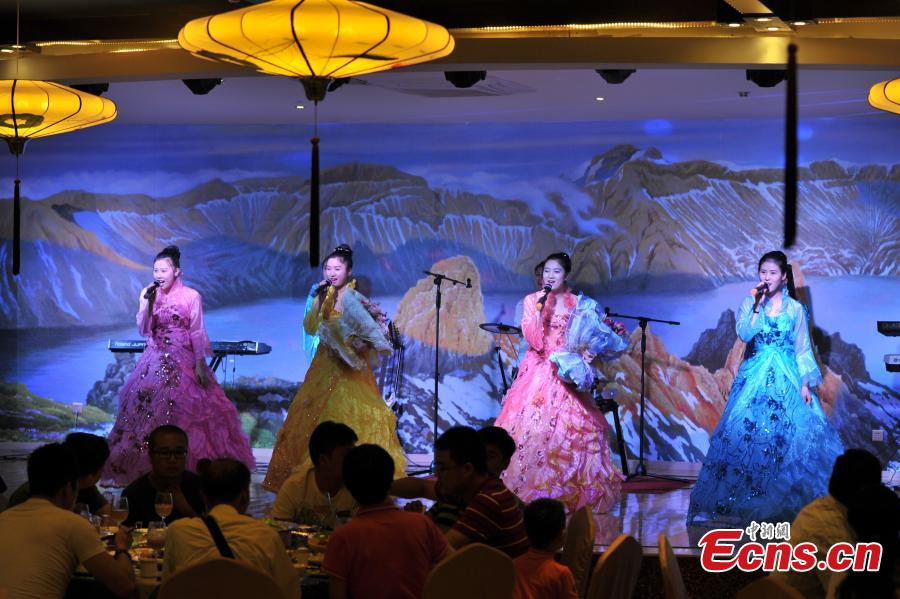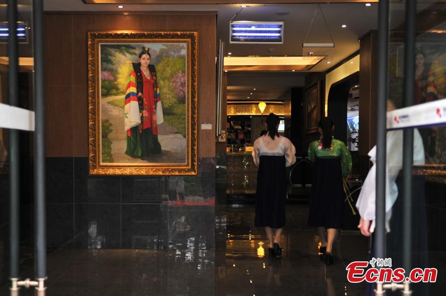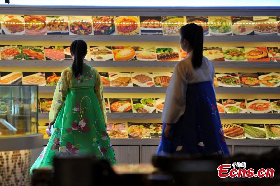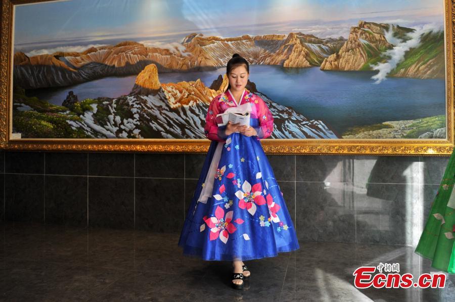 A waitress from the Democratic People's Republic of Korea studies Chinese as she works, while another greets customers at the entrance of a restaurant in Kunming, Southwest China’s Yunnan province, July 22, 2015. Some 30 waitresses from the DPRK work in the restaurant and are responsible for greeting customers, ordering and delivering dishes, and taking part in performances. Their salaries are paid by the DPRK. (Photo: China News Service/Ren Dong)