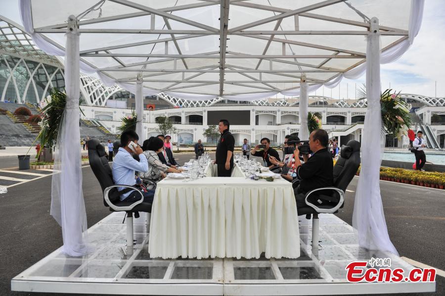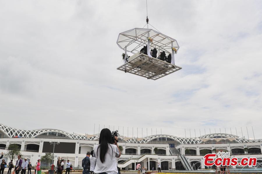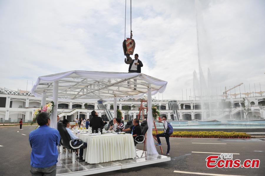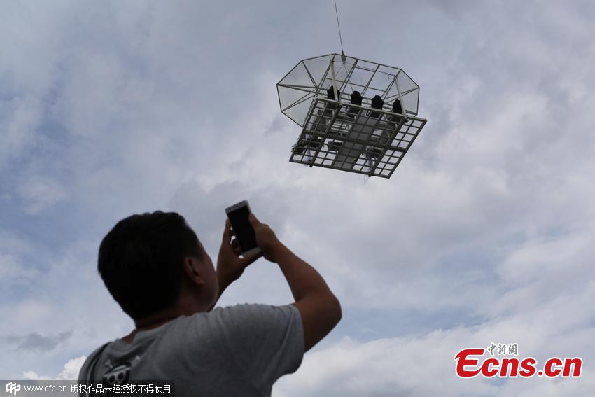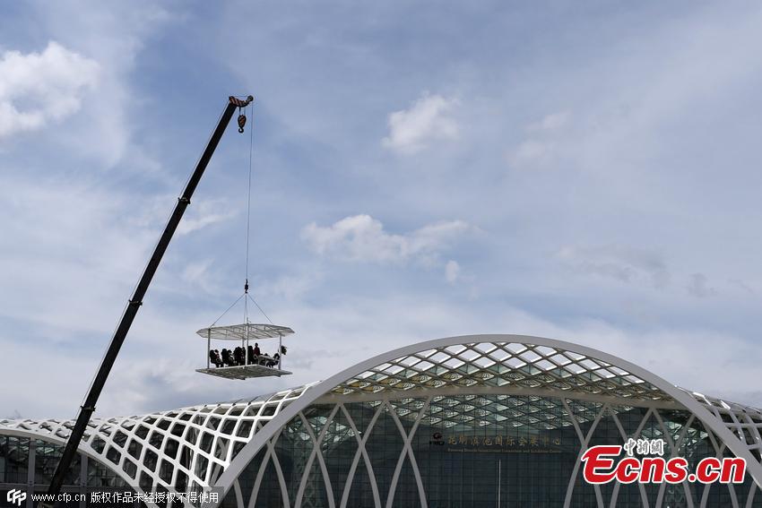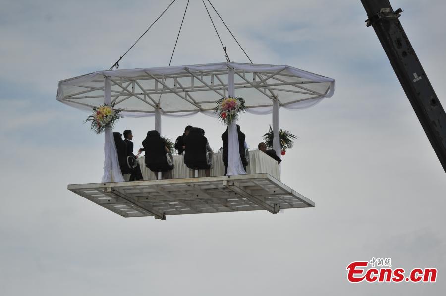 Daredevils dine at a restaurant suspended 30 meters up in the air outside the Dianchi International Conference and Exhibition Center in Kunming, Southwest China’s Yunnan province, July 22, 2015. Dining there costs 8,888 yuan ($1,431) for each customer. (Photo: China News Service/Ren Dong)