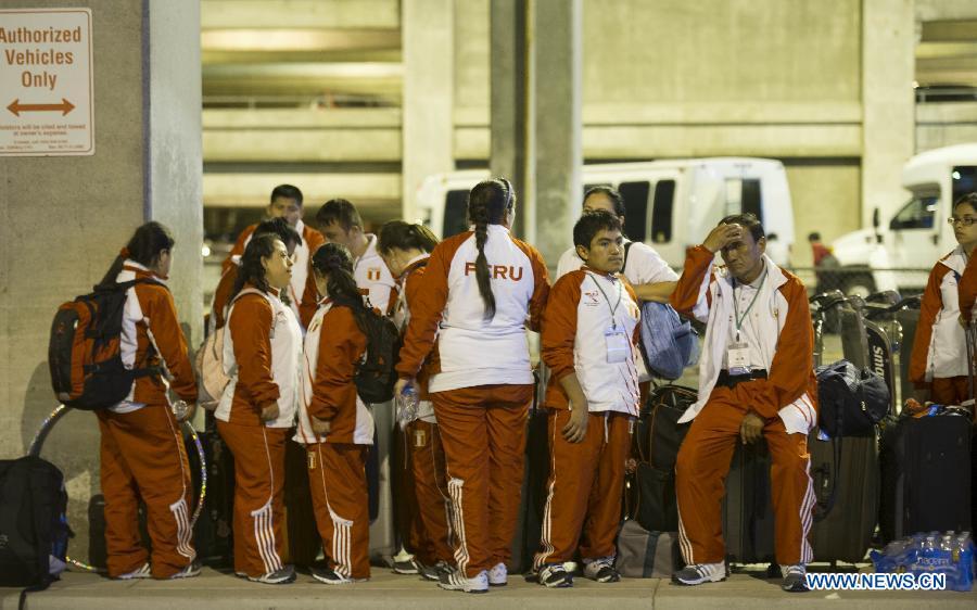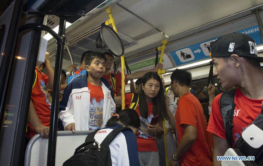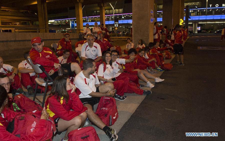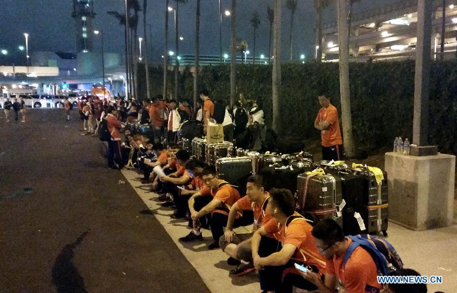 Chinese national team for 2015 Special Olympics World Summer Games wait for the shuttle bus at the Los Angeles International Airport in California, the United States, July 21, 2015. Due to the transportation failure of the Organizing Committee of 2015 Special Olympics World Summer Games, a lot of teams arriving at the airport stranded for a long time. Chinese national team got to leave the airport at 23:55 after nearly 4 hours waiting. (Photo: Xinhua/Zhao Qian)