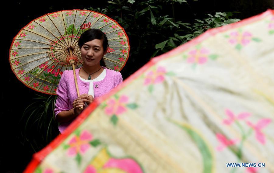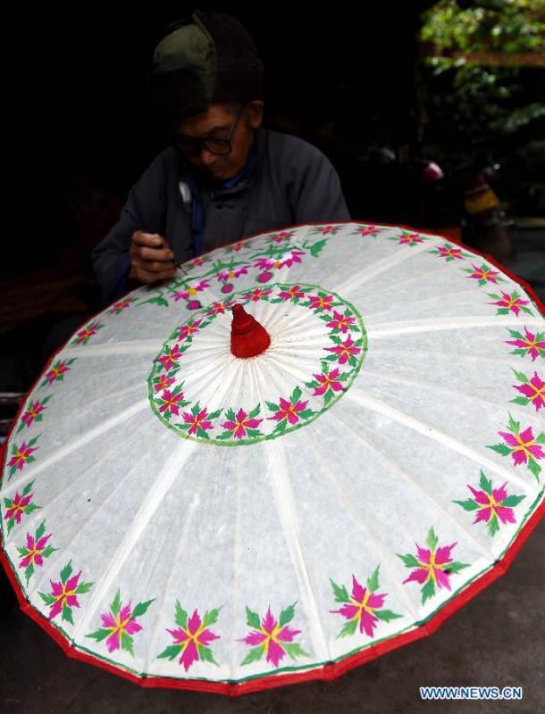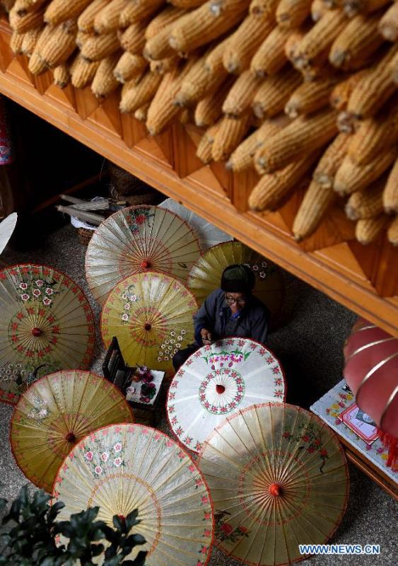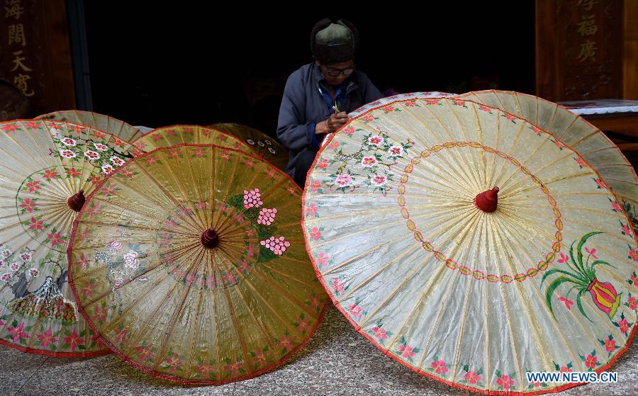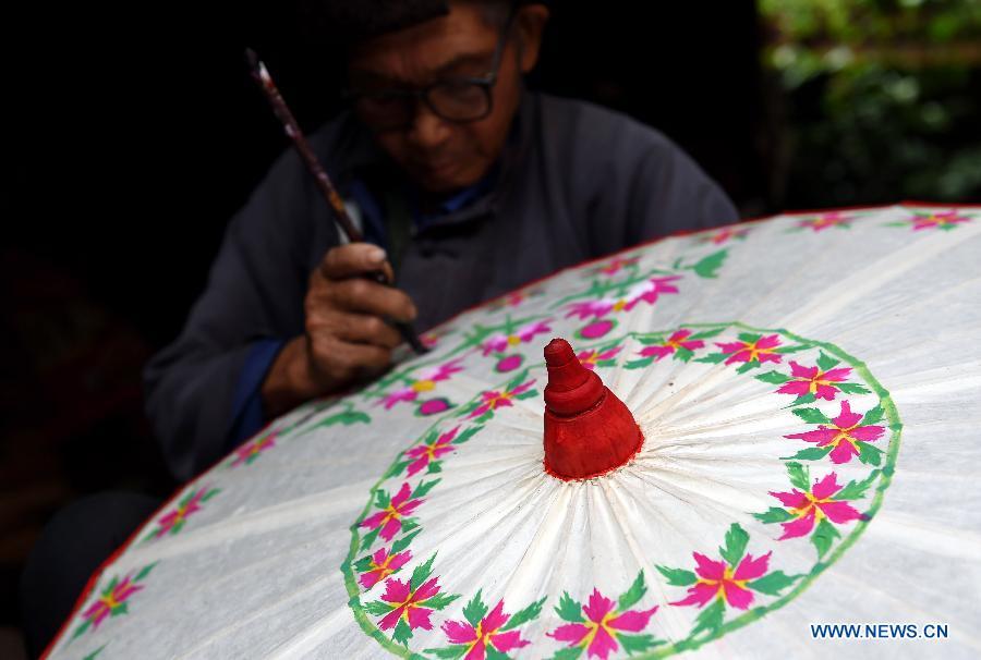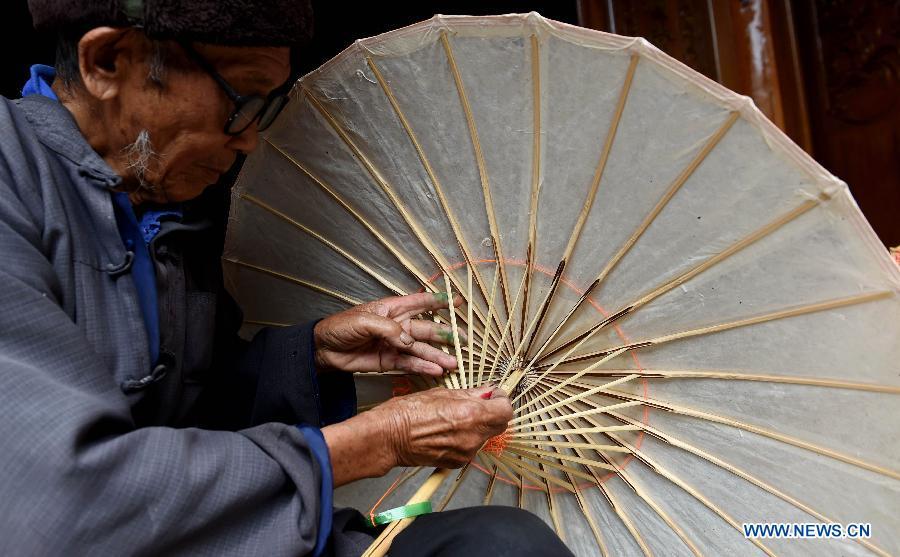 Craftsman and inheritor Zheng Yinghai, 89, makes oil-paper umbrellas in Yunyang village of Tengchong, southwest China's Yunnan Province, July 22, 2015. Made of oiled paper and bamboo frames, oil-paper umbrella is a traditional Chinese handicraft. Making oil-paper umbrella is an over 100-year-old tradition in Yunyang and is revived in recent years under the support of local government. (Photo: Xinhua/Lin Yiguang)
