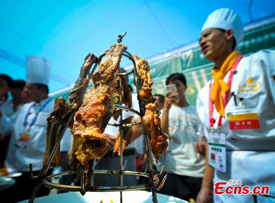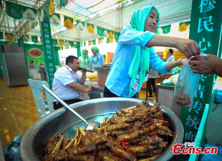 Food products are on display at the second Silk Road International Food Exhibition Fair held at the International Conference and Exhibition Center in Urumqi city, capital of Northwest China’s Xinjiang Uygur autonomous region, July 23, 2015. Enterprises from 40 countries and regions have displayed a great variety of food at the fair, which also includes a barbecuing contest and demonstration cooking by chefs. (Photo: China News Service/Liu Xin)