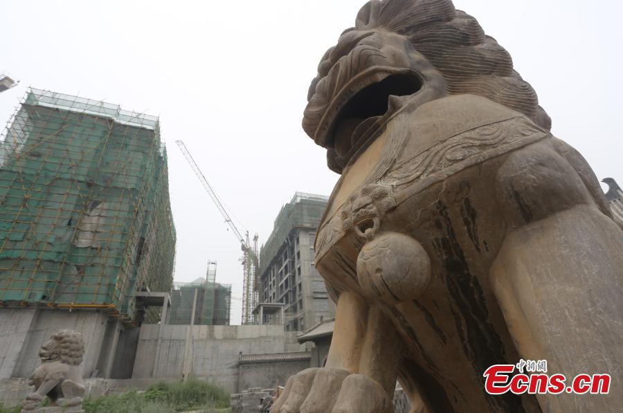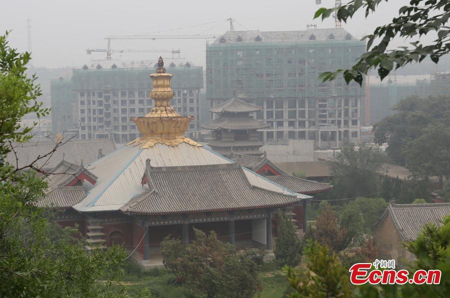Donglin Temple is being dwarfed by new buildings in Zhengzhou city, Central China’s Henan province, July 23, 2015. With a history of more than 1,800 years, the temple is situated on a hillside 18 kilometers southwest of Zhengzhou, and looks over a lake. Many real estate developers have built villas and high-rises near the temple in recent years to take advantage of the unique location, but continuous construction noise has been disrupting the tranquility of the temple. (Photo: China News Service/Yang Zhenghua)