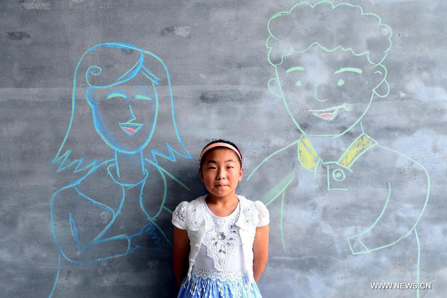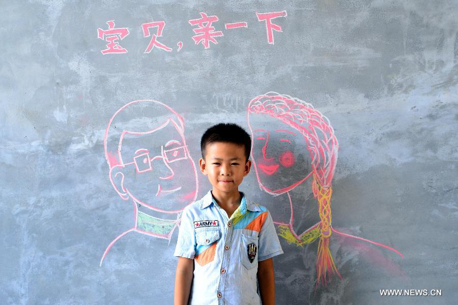 An old woman "has dinner" with her children painted on a blackboard in Suanzili Village of Xiaozhuang County, east China's Shandong Province, July 25, 2015. College students from the Academy of Fine Arts of Liaocheng University came to visit the "left-behind" children and "empty-nest" elderly persons, help them express their wish for family reunion with paintings. (Photo: Xinhua/Zhao Yuguo)