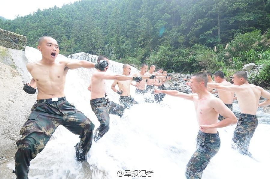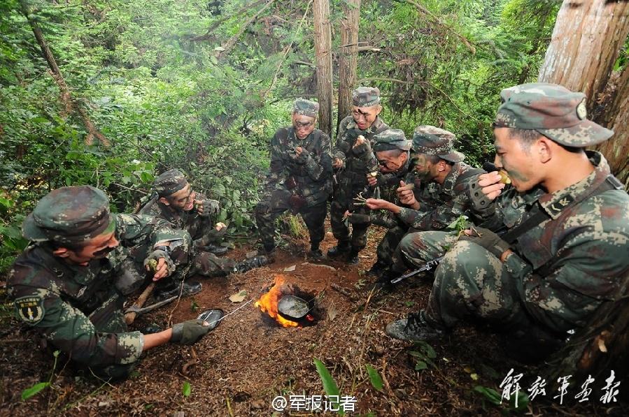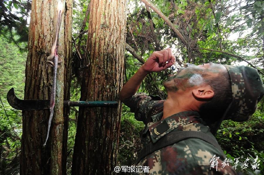 One regiment of the the Second Artillery Force conducted special physical training in deep mountains and forests. The soldiers had to find whatever they can to feed themselves, including snake and frog. (Photo: Liberation Army Daily/Li Xiaodong)