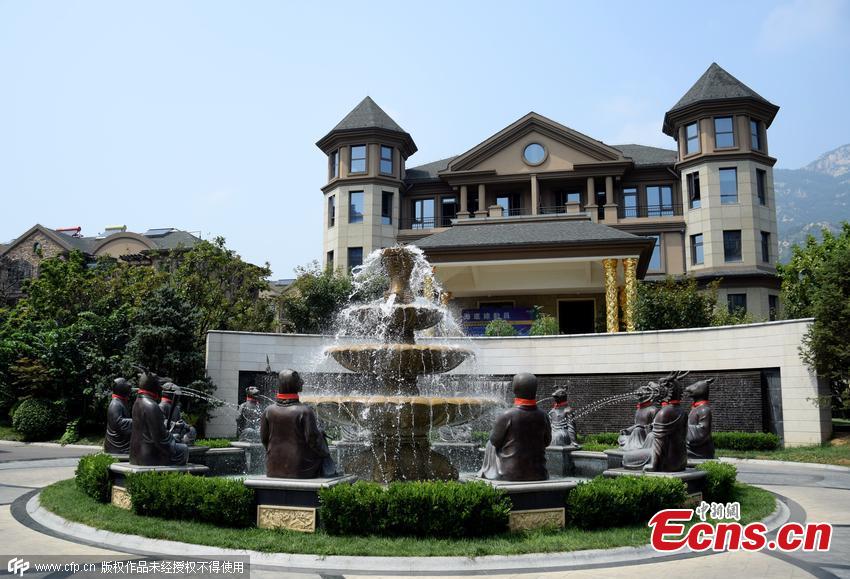 Replicas of zodiac animal sculptures from Yuan Ming Yuan, also known as the Old Summer Palace, are displayed at the entrance to a high-end residential area at the foot of Taishan Mountain in Tai’an city, East China’s Shandong province. The full-size sculptures cost 100,000 yuan ($16,100). In the past, bronze sculptures of the 12 Chinese zodiac animals in the Old Summer Palace had water pipes protruding from their mouths that projected water. (Photo/CFP)