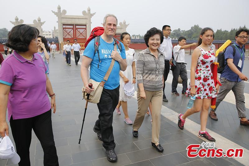 Lord Bates and his wife start their journey at Beijing Temple of Heaven, July 27, 2015. To mark the 70th anniversary of the victory of the World Anti-Fascist War, British Lord Bates and his Chinese wife will spend about 64 days to walk to Hangzhou from Beijing Temple of Heaven on foot. (CNS photo/Wangjun)
