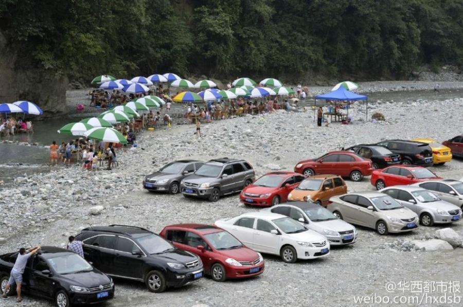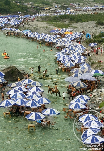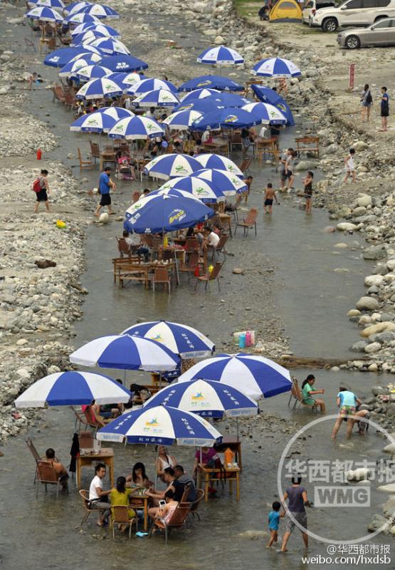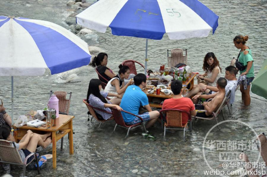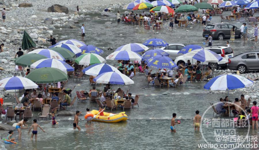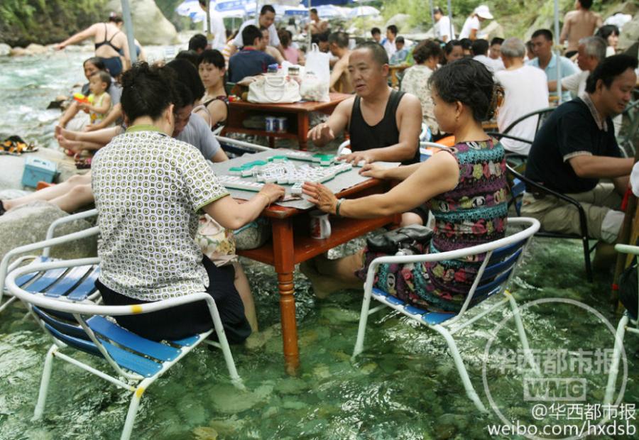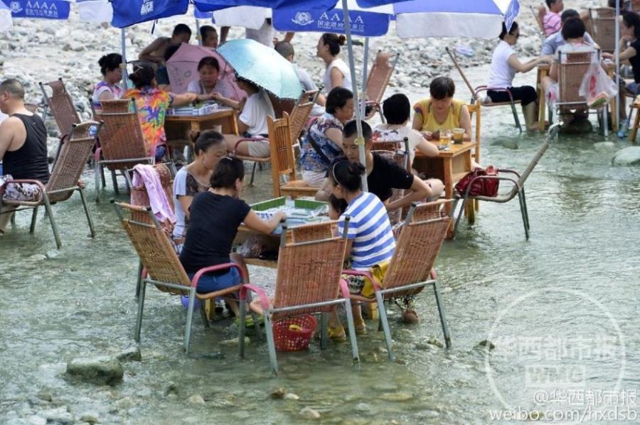 Residents play mahjong in a river in Longchi town, Dujiangyan city, southwest China’s Sichuan province, as the city recorded 38 degrees Celsius over the weekend. Mahjong is a hugely popular game in the region. During summer, many people place tables along the riverbank to enjoy the cool water while playing the game, forming a spectacular scene. (Photo: Weibo of West China Metropolis Daily)