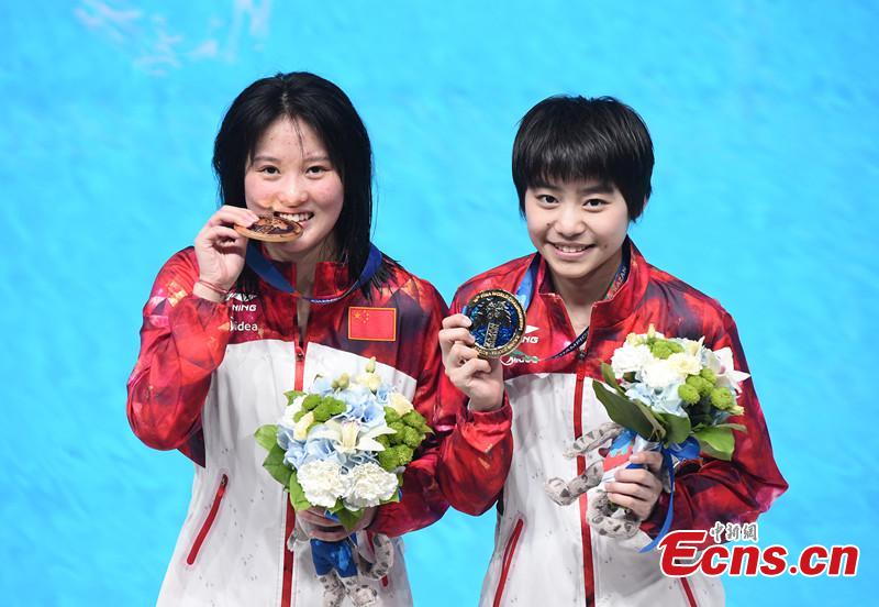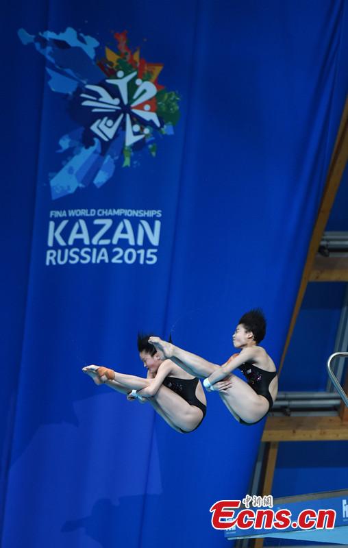 Chen Ruolin and Liu Huixia of China compete during the women's 10m platform synchronized diving final at the 2015 Swimming World Championships in Kazan, Russia, July 27, 2015. Chen and Liu claimed the title of the event with a score of 395.52 points. (CNS photo/Houyu)