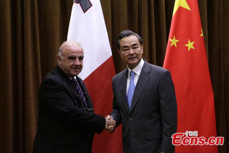 Chinese Foreign Minister Wang Yi (R) shakes hands with his Maltese counterpart George Vella during their talks in Beijing, China, July 27, 2015. (CNS photo/Li Huisi)