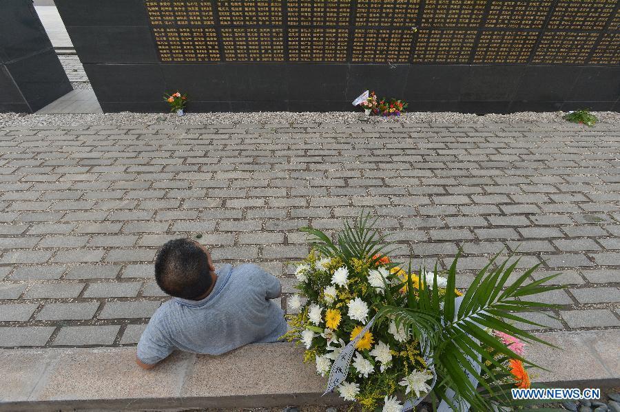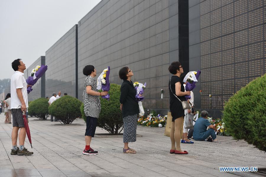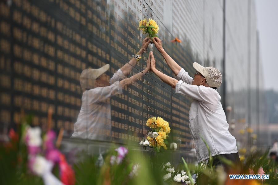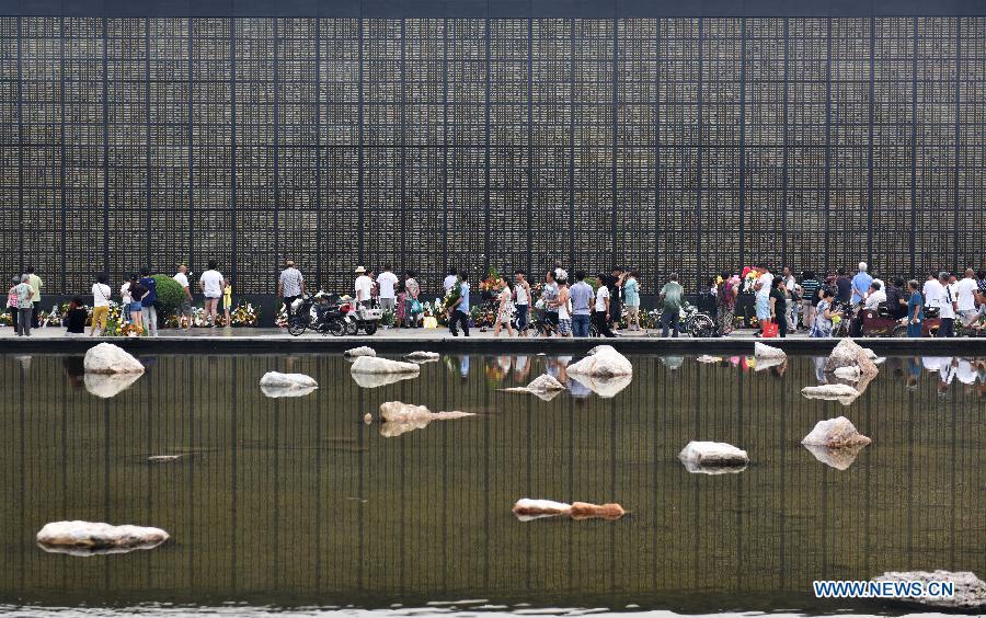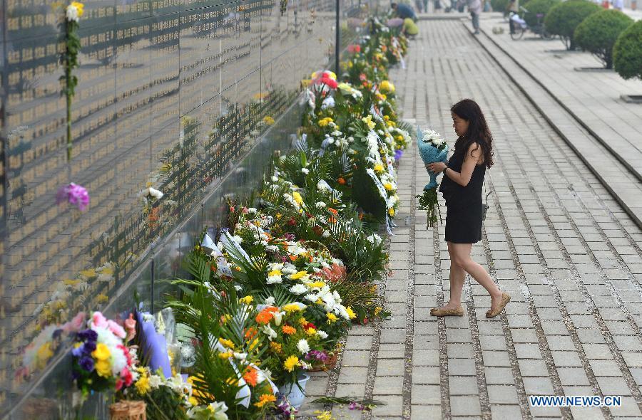People offer flowers to relatives dead in the 1976 Tangshan earthquake in front of the memorial wall in Tangshan, north China's Hebei Province, July 28, 2015. Local residents came to the memorial park on Tuesday to commemorate the 39th anniversary of the Tangshan earthquake. (Photo: Xinhua/Li Junyi)