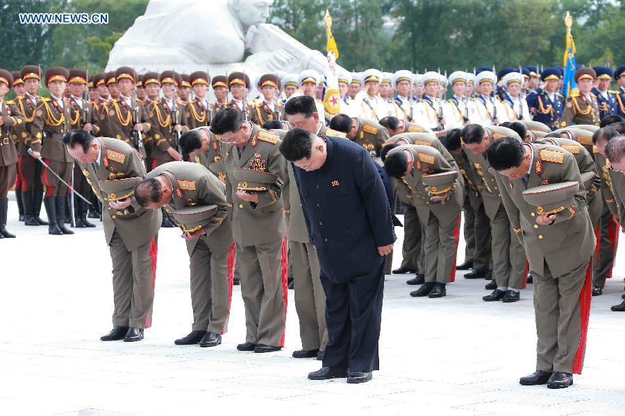 Photo provided by Korean Central News Agency (KCNA) on July 28, 2015 shows top leader of the Democratic People's Republic of Korea (DPRK) Kim Jong Un (C) visiting the Fatherland Liberation War Martyrs Cemetery on the occasion of the 62nd anniversary of the victory in the great Fatherland Liberation War of the DPRK, to pay high tribute to the fallen fighters of the People's Army on July 27, 2015. A wreath in the name of Kim Jong Un was placed before the cemetery. Kim Jong Un, together with the visitors, paid a silent tribute to the memory of the fallen fighters of the KPA. (Xinhua/KCNA)