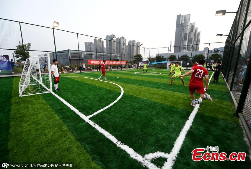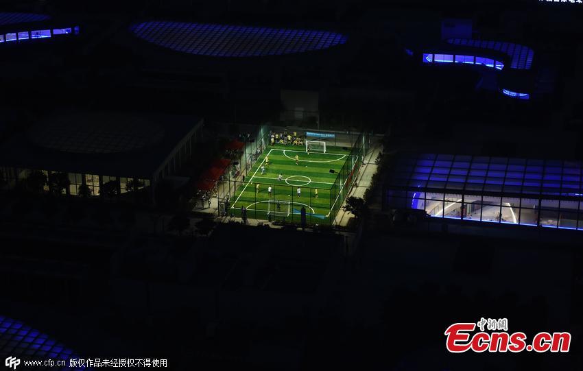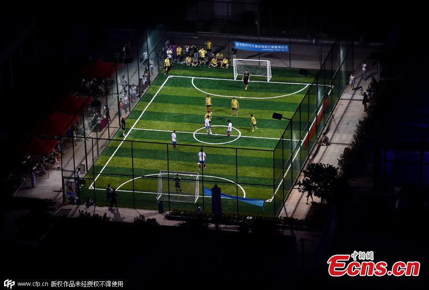 People play football on the roof of a shopping mall in Luoyang city, Central China’s Henan province, July 28, 2015. Luoyang’s first Futsal event was held here, attracting the attention of some shoppers. Futsal, a five-a-side football competition, is usually played on a smaller field or indoors. A source said that the field can be used by young men who dislike accompanying their girlfriends shopping. (Photo/CFP)