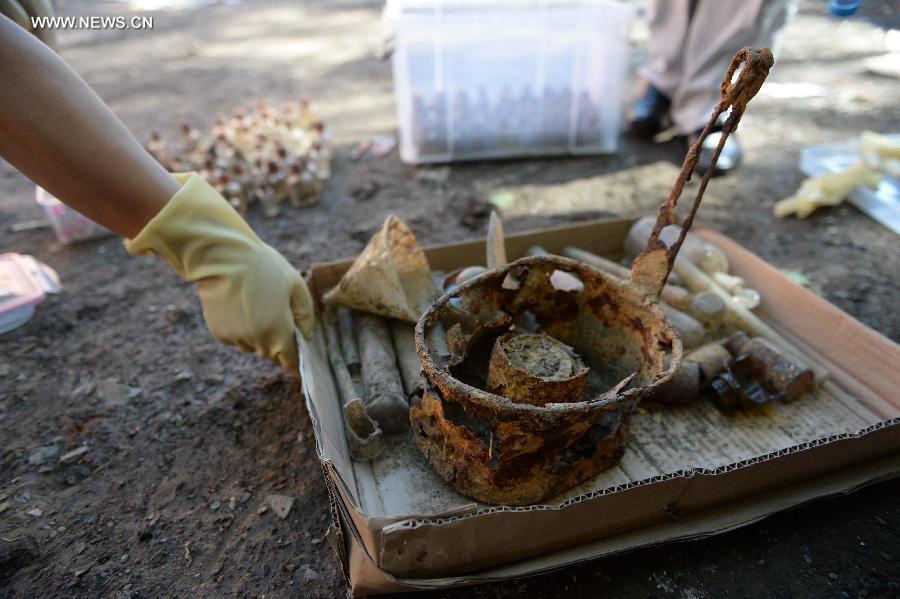 Photo taken on July 28, 2015 shows relics excavated from the remains of Japan's notorious Unit 731 headquarters in Harbin, northeast China's Heilongjiang Province. Incineration pits and traces of explosives left by Japanese invaders destroying evidence have been found at the remains of Japan's notorious Unit 731 headquarters in Harbin. The new findings were part of an operation to destroy a bacteria lab and burn experimental facilities at the site. Unit 731 was a top-secret biological and chemical warfare research base established in Harbin in 1935 as the center of Japan's biological warfare in China and Southeast Asia during WWII. The retreating Japanese invaders blew up the base when the Soviet Union took Harbin in 1945. (Photo: Xinhua/Wang Kai)