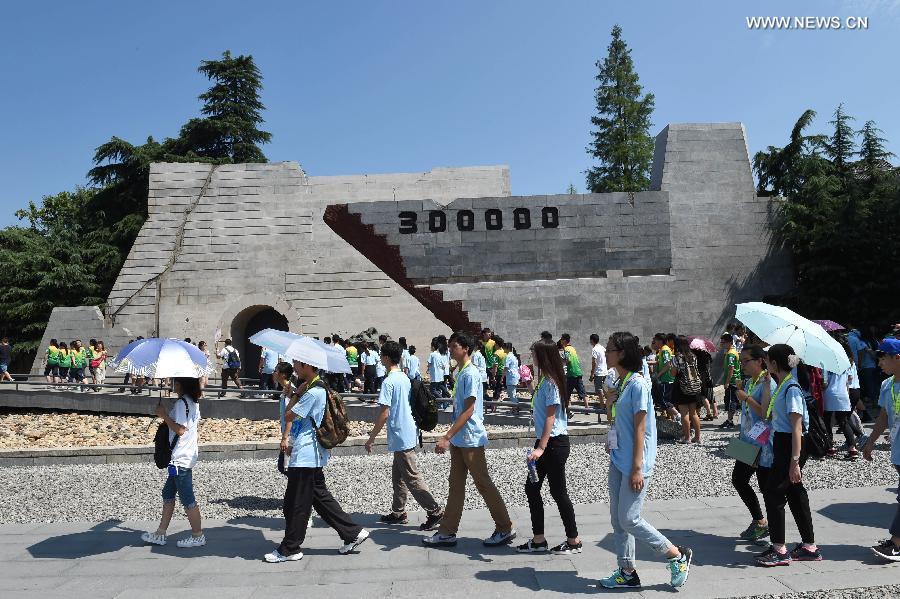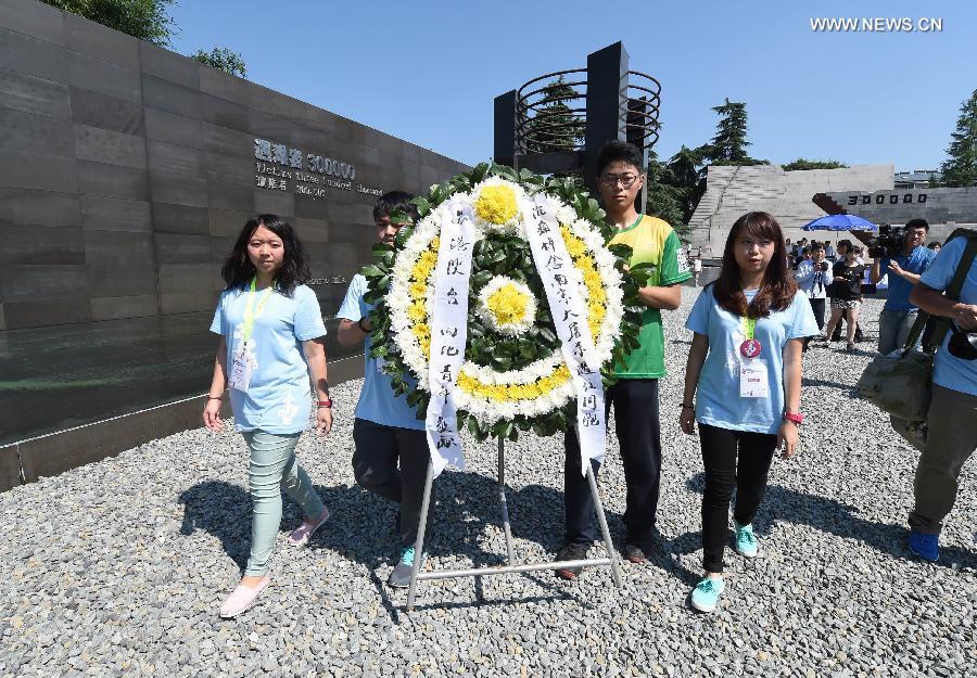 Representatives of students offers a wreath at the Memorial Hall of the Victims in Nanjing Massacre by Japanese Invaders in Nanjing, capital of east China's Jiangsu Province, July 29, 2015. Some 1200 students from China's Jiangsu Province, Hong Kong, Macao and Taiwan visited the memorial hall on Wednesday to commemorate the victims killed by the Japanese Army and also the 70th anniversary of the victory of the Chinese People's War of Resistance Against Japanese Aggression and World War II. (Photo: Xinhua/Sun Can)