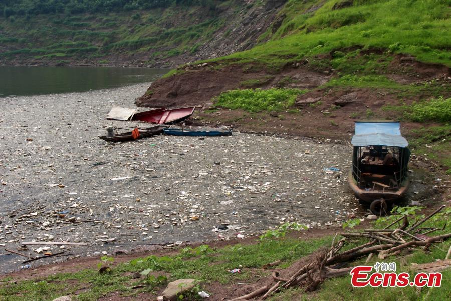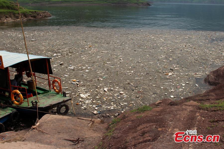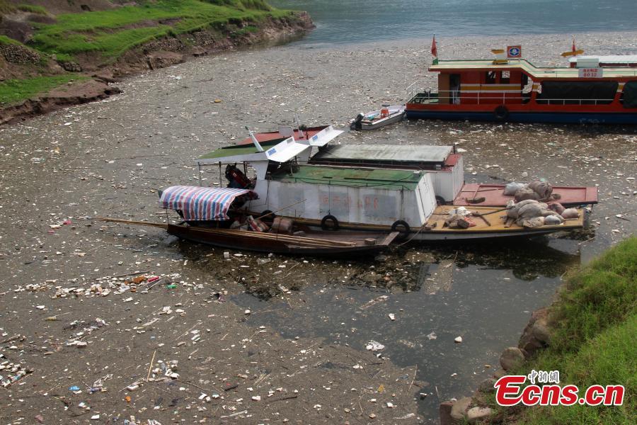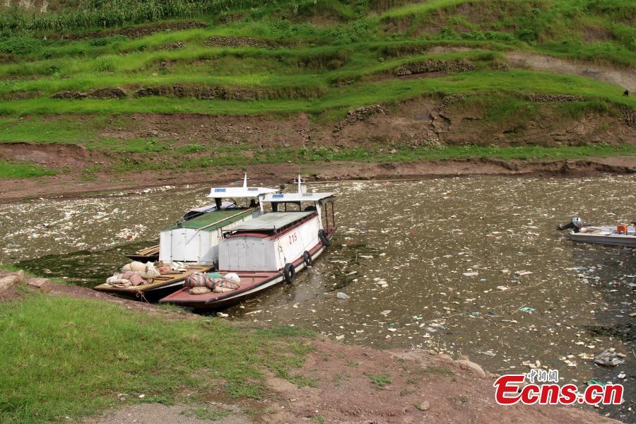 Sanitation workers clear up garbage floating on the Yangtze River in Yunyang county, Southwest China’s Chongqing municipality, July 29, 2015. Rising water levels after upstream rainfall has caused tons of garbage to gather there and affected shipping routes. (Photo: China News Service/Liu Xiao)