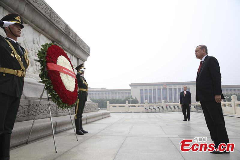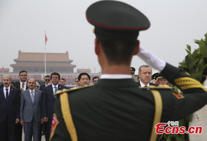 Turkish President Recep Tayyip Erdogan presents a wreath to the Monument to the People's Heroes in Beijing, capital of China, July 29, 2015. (CNS photo/Liu Guanguan)